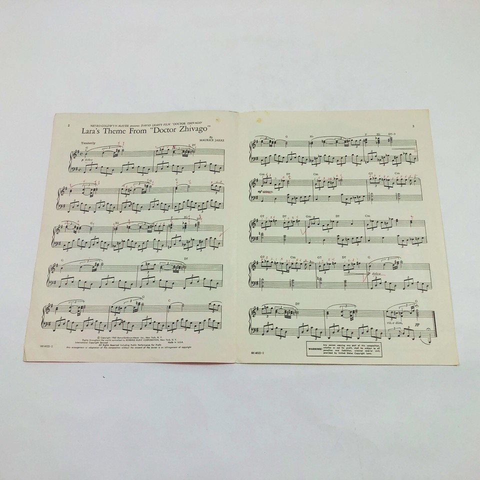 "Lara's Theme" From "Doctor Zhivago"by Maurice Jarre. Published by Robbins Music Corp.,NY Copyright 1965. In very good condition. The fold is still intact and only minor wear on the corners and edges. Some hand written notes inside.