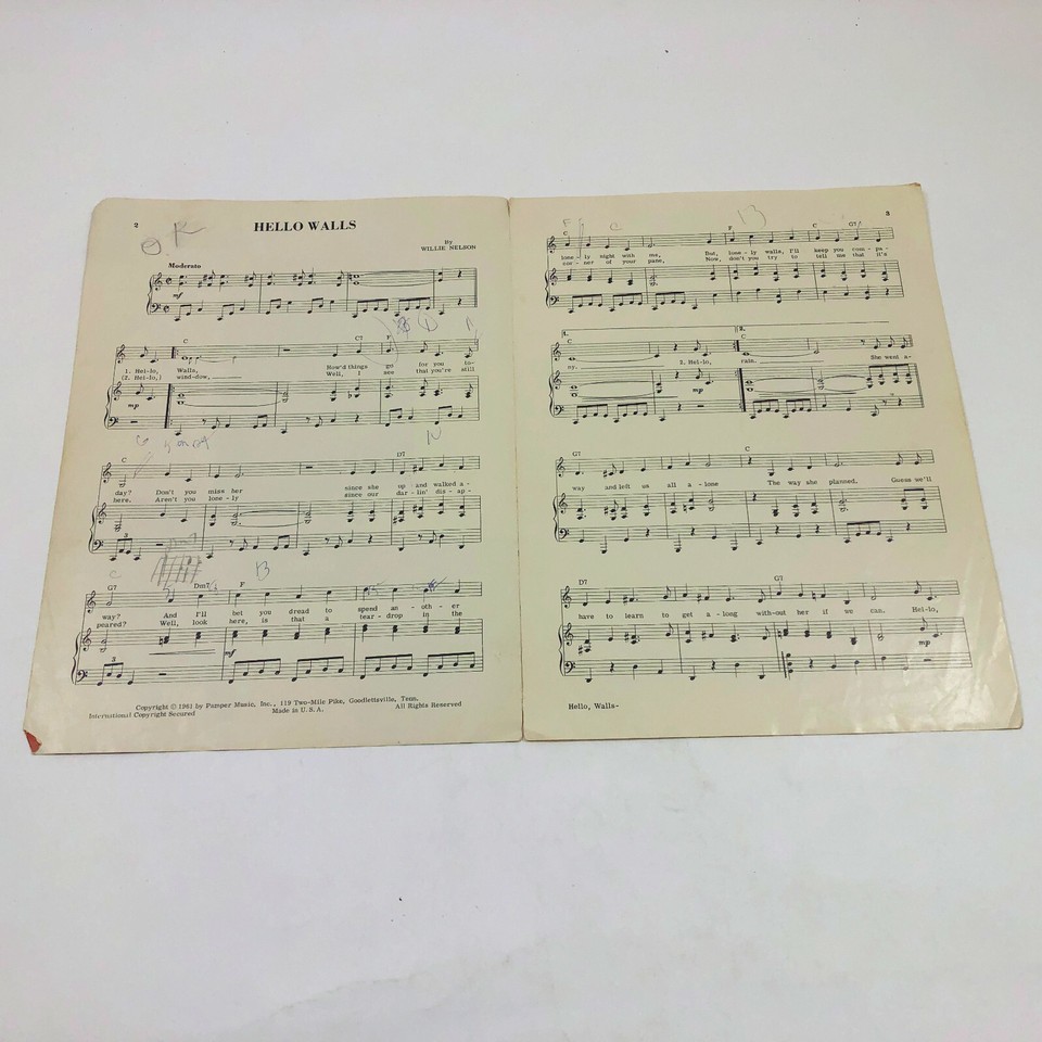 "Hello Walls" by Willie Nelson. Published by Pamper Music Inc. Copyright 1961. The bottom part of the fold has come apart, There are some written notes inside. Some wear on the corners and edges. See the pictures.