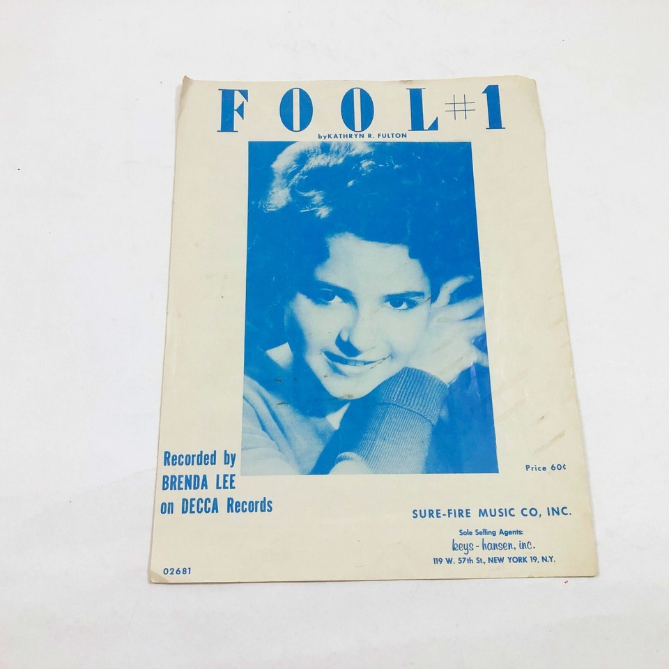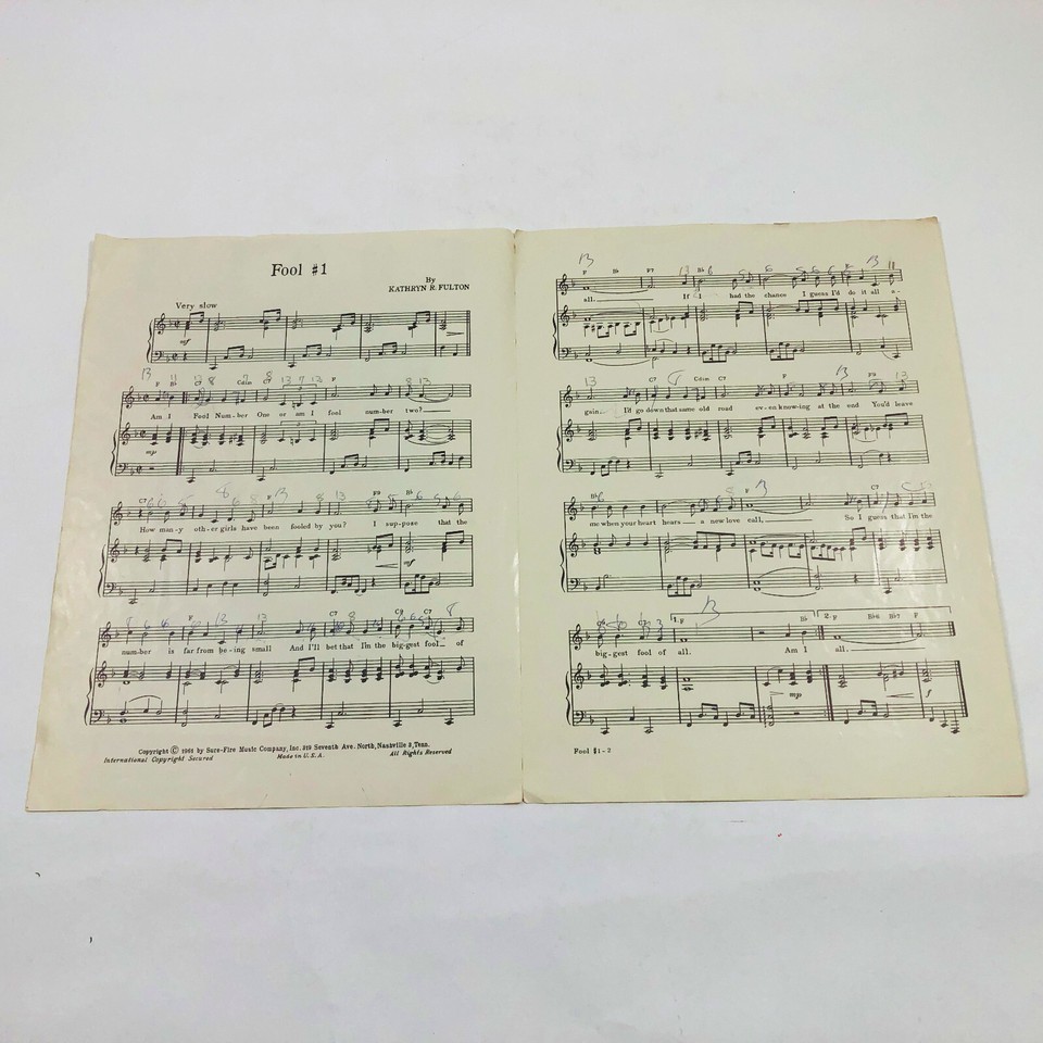 "Fool #1" by Kathryn R. Fulton. Published by Sure-Fire Music Co. Copyright 1961. The fold is still mostly intact with only some small splits. Written notes inside and some wear on the edges and corners.