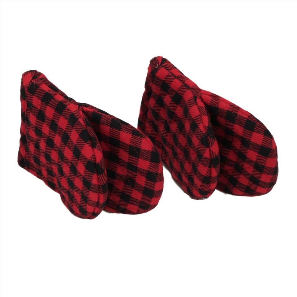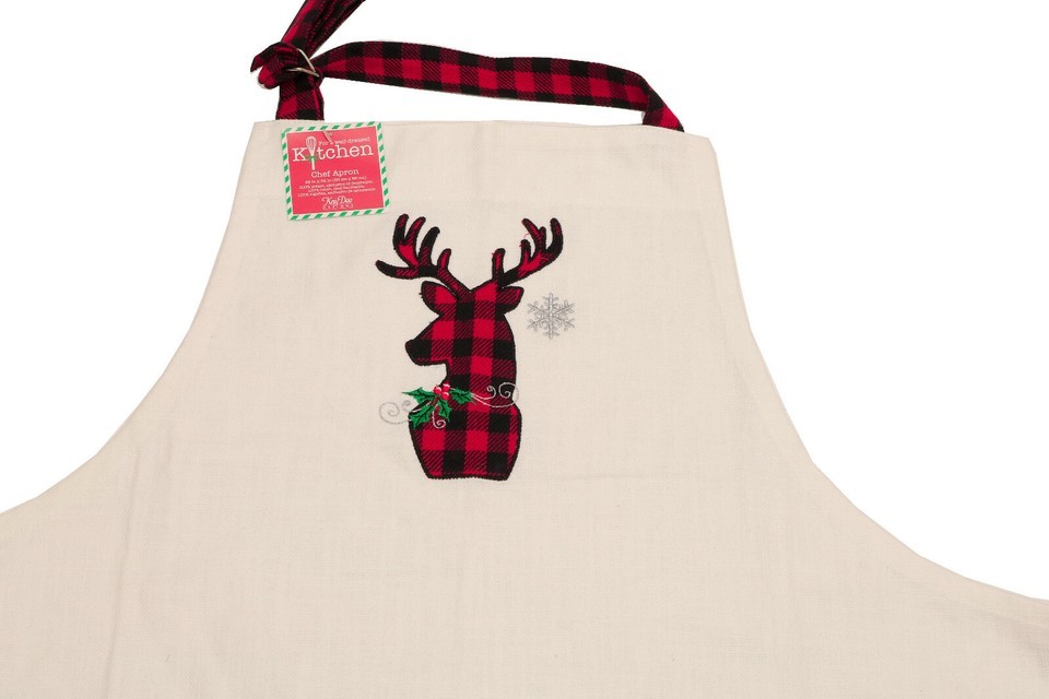 Beautiful 3 piece Kay Dee Designs Camp Deer apron and pot mitts set. Look Festive while baking those holiday treats of entertaining at your holiday party with this pretty apron and matching 2 grabber mitts. This off white apron is decorated with a red and black deer accented with a sprig of holly tied with metallic silver thread. The bottom of the apron has a wide border of red and black check with an embroidered red accent. The neck ties are adjustable. The tie at the waist is also in black and red check. There is also a black and red checked pocket accented with silver metallic braid.