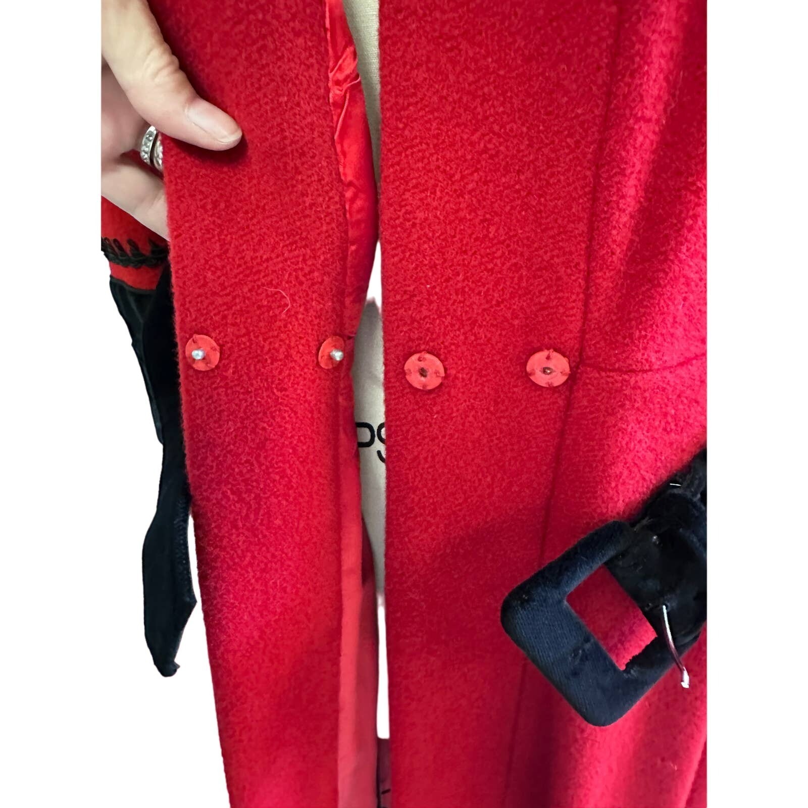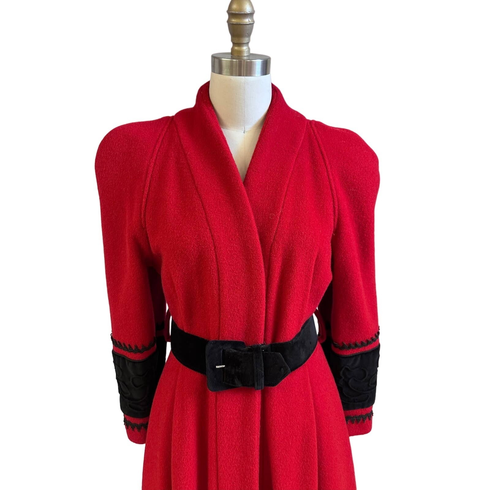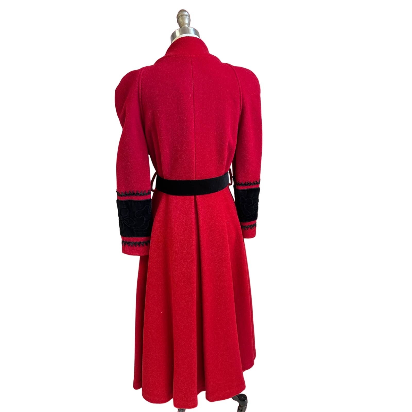 Vintage 1980s red wool and mohair blend coat in a dramatic cossack-inspired design with strong padded shoulders, nipped waist, and full skirt reminiscent of the 1940s ?New Look.? Features black embroidered sleeve trim, matching black suede belt, double waist snaps, and a slight wrap-front closure. Fully lined in red satin. A stunner with couture-level presence.
