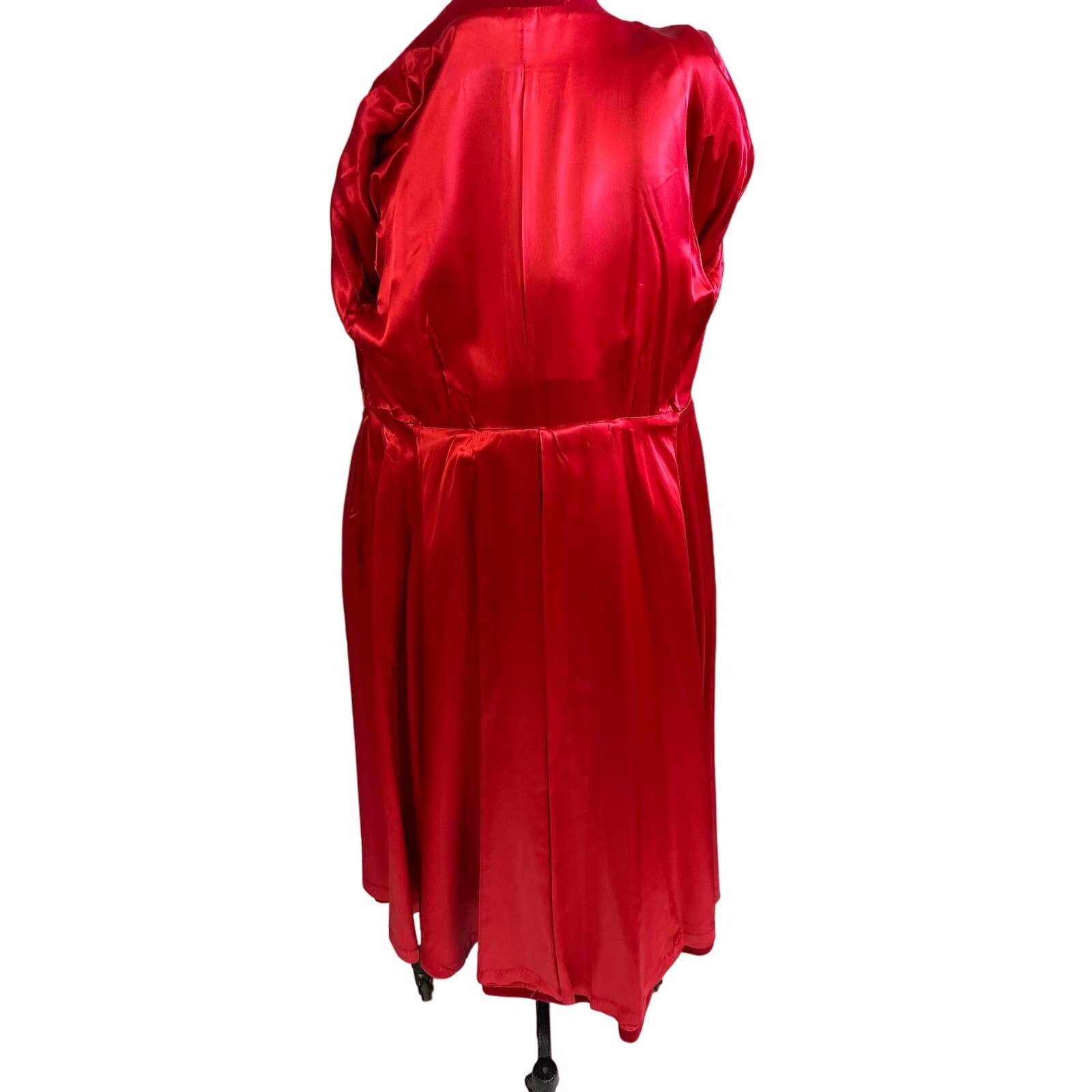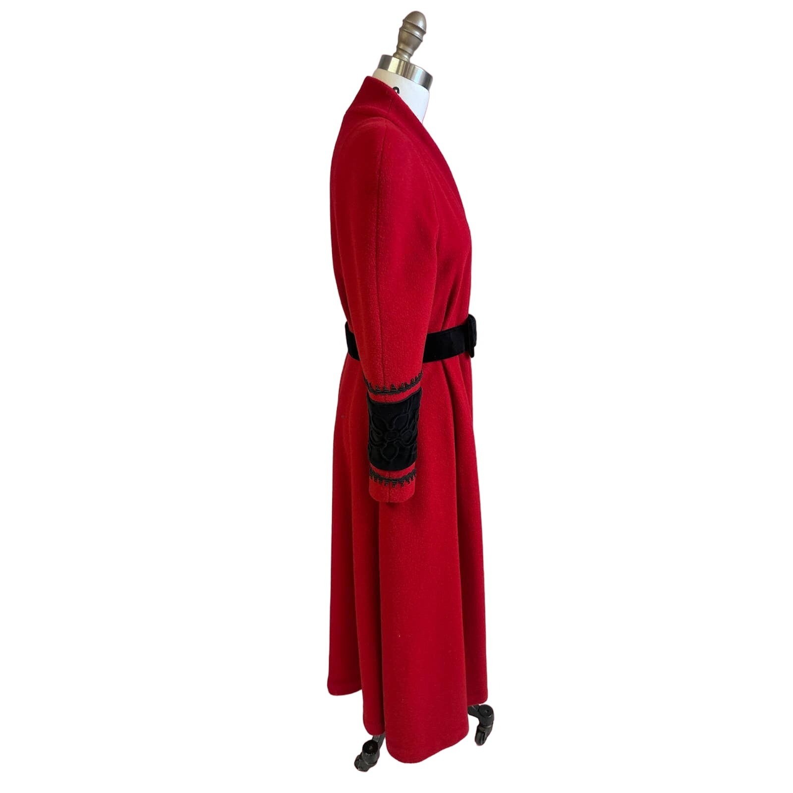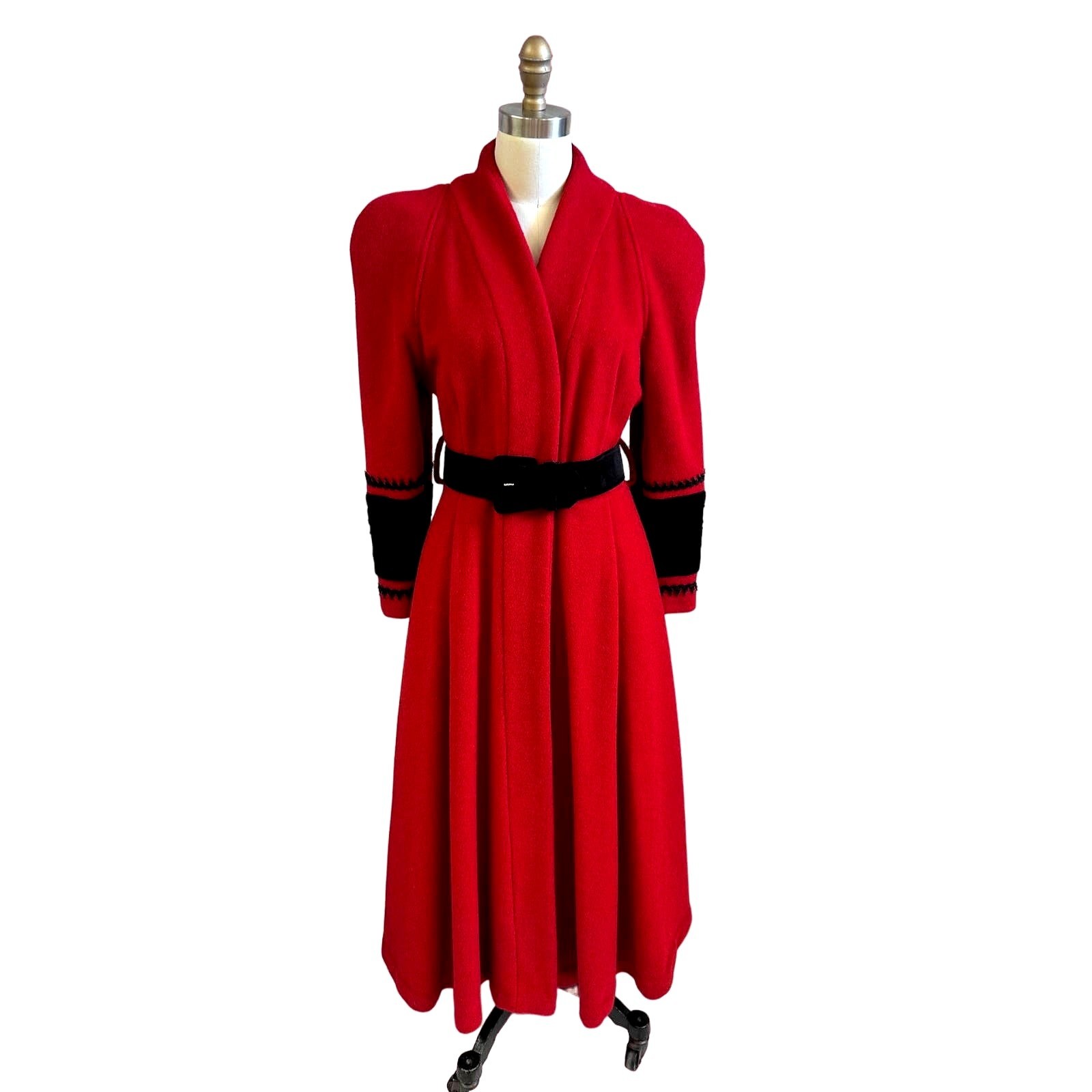 Vintage 1980s red wool and mohair blend coat in a dramatic cossack-inspired design with strong padded shoulders, nipped waist, and full skirt reminiscent of the 1940s ?New Look.? Features black embroidered sleeve trim, matching black suede belt, double waist snaps, and a slight wrap-front closure. Fully lined in red satin. A stunner with couture-level presence.
