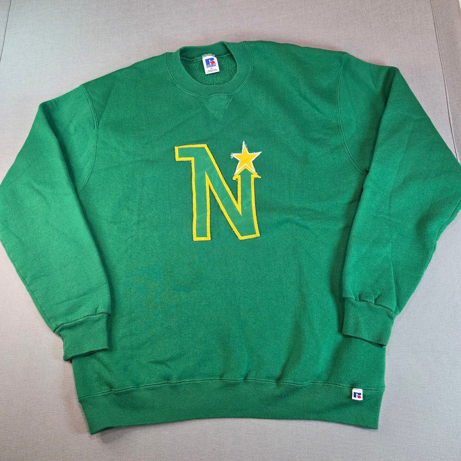 Authentic vintage 1980s Russell Athletic Minnesota North Stars crewneck sweatshirt, featuring the classic chain-stitched ?N bigstar;? logo. Made in the USA from a heavyweight cotton-blend fleece. A rare original piece from the team?s pre-1993 era. Minor loose stitching on the star embroidery but otherwise well-preserved for its age.