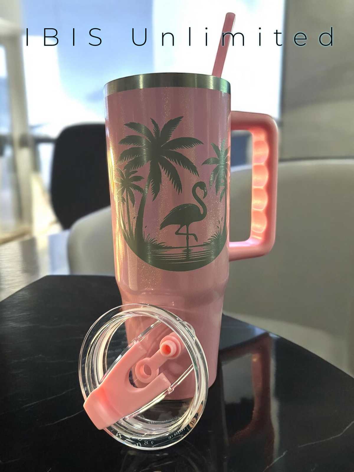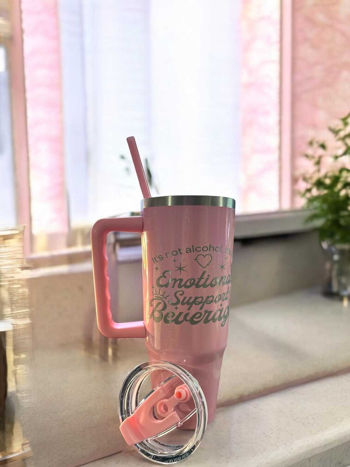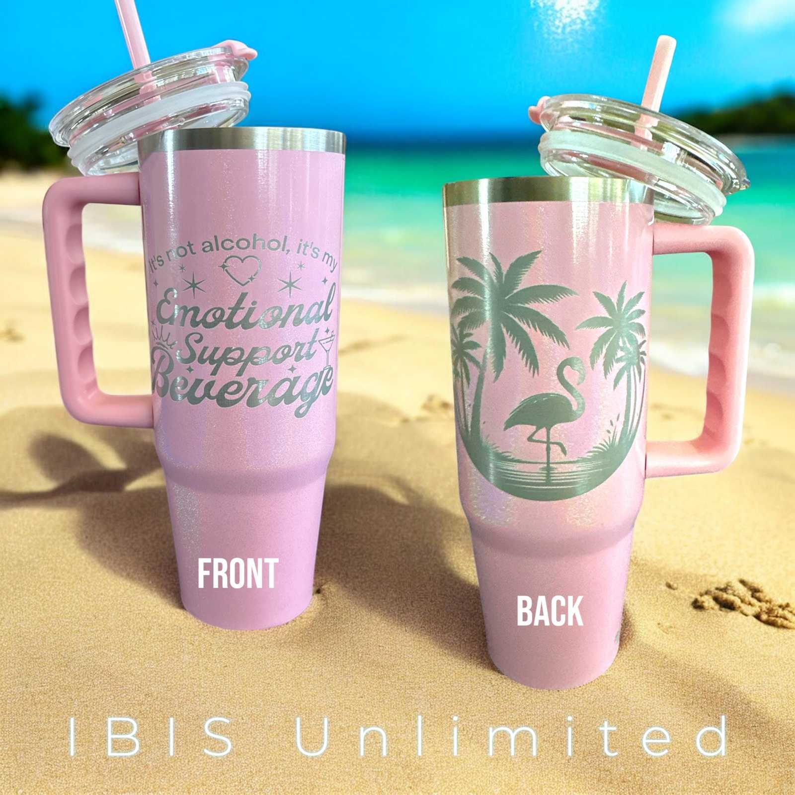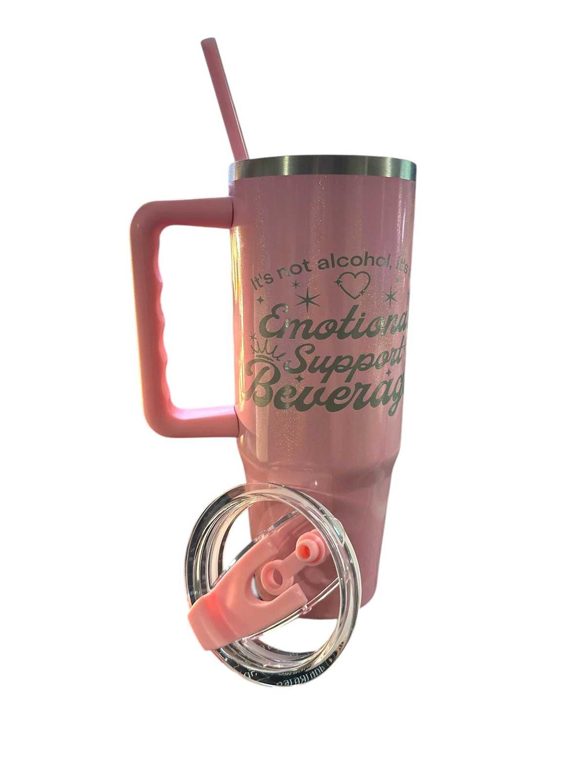 Emotional support sparkle pink flamingo tumbler. This comes in a 30oz size with a free gift.