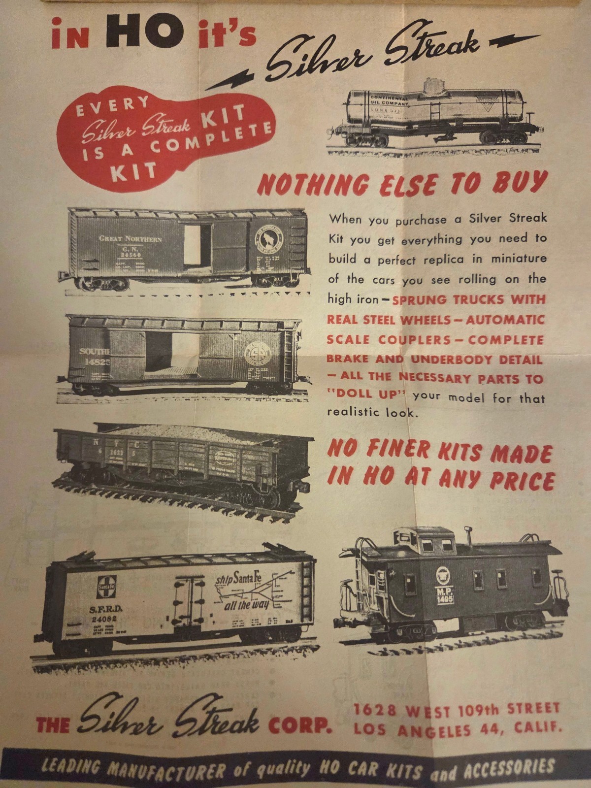 The Northern Pacific Caboose Car HO Silver Streak SS104 is a vintage model train accessory manufactured in the United States in the 1960s. This pre-built caboose is designed with a wooden and plastic construction, featuring a classic silver and black color scheme. It operates on a two-rail system and is suitable for collectors aged 17 years and up. The caboose is a ready-to-go piece that adds authenticity to a model railroad layout, depicting the transportation theme characteristic of the Northern Pacific train operating company.
