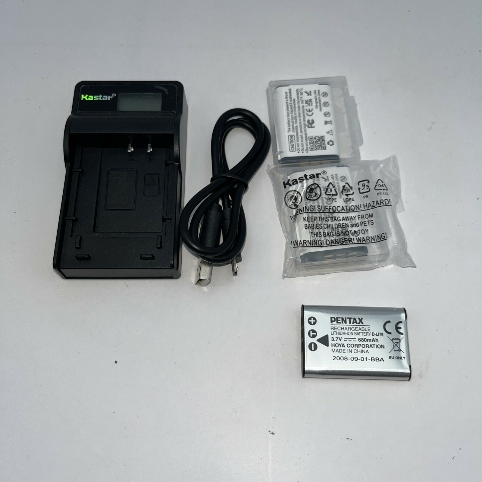 Pentax Optio W60 Waterproof 10MP Digital Camera 5X Wide Angle Optical Zoom with 3 batteries. One battery is oem and two are generic. The charger is also generic but works well. I used it to charge the battery for testing. Original box, cables, and cd included.