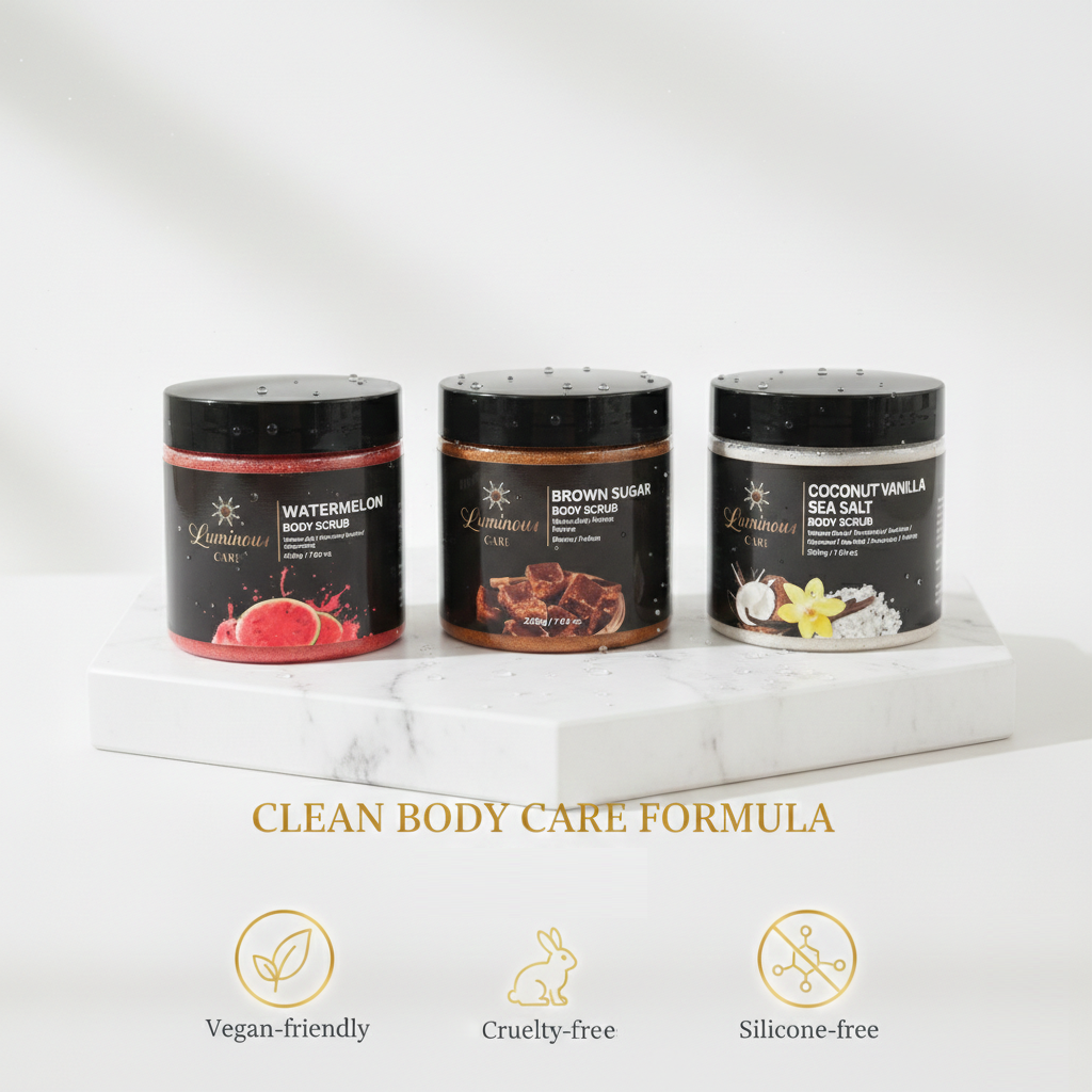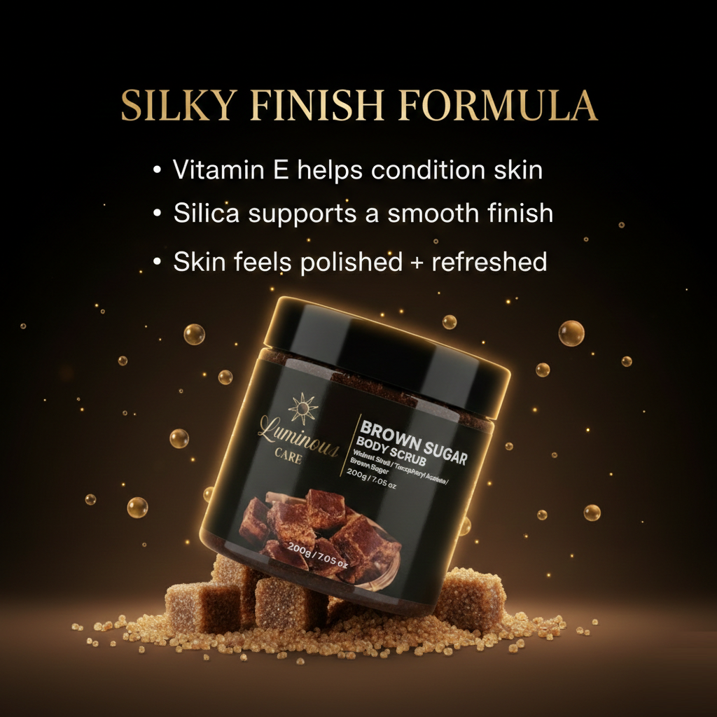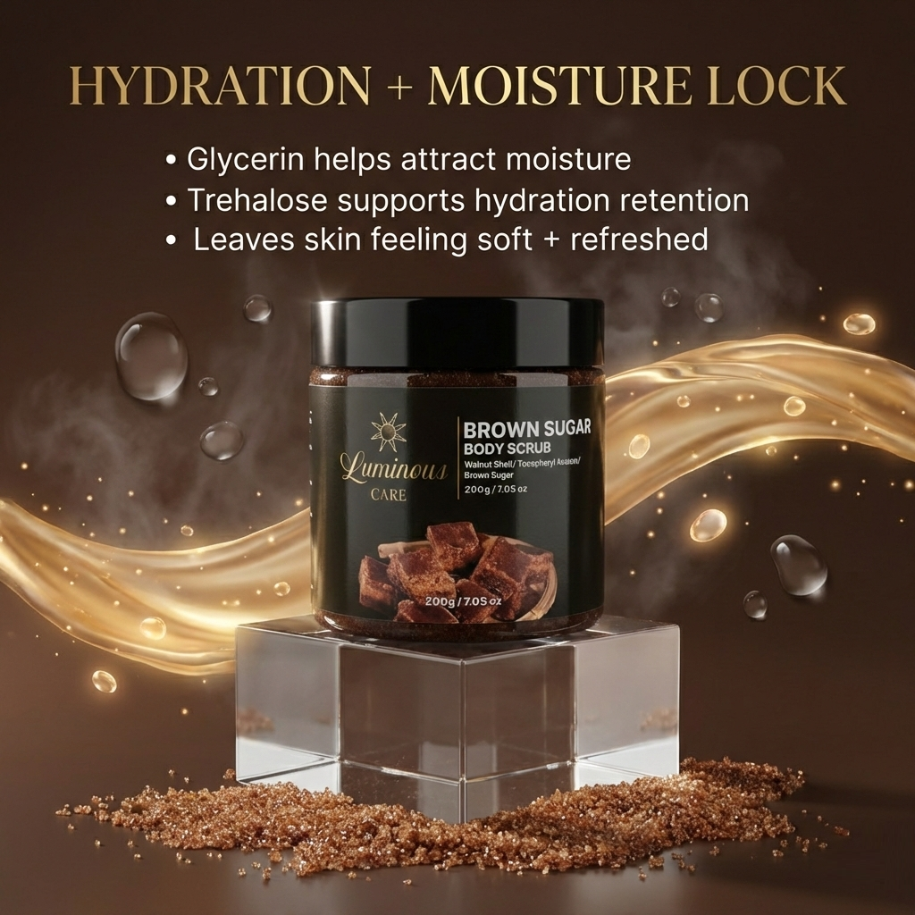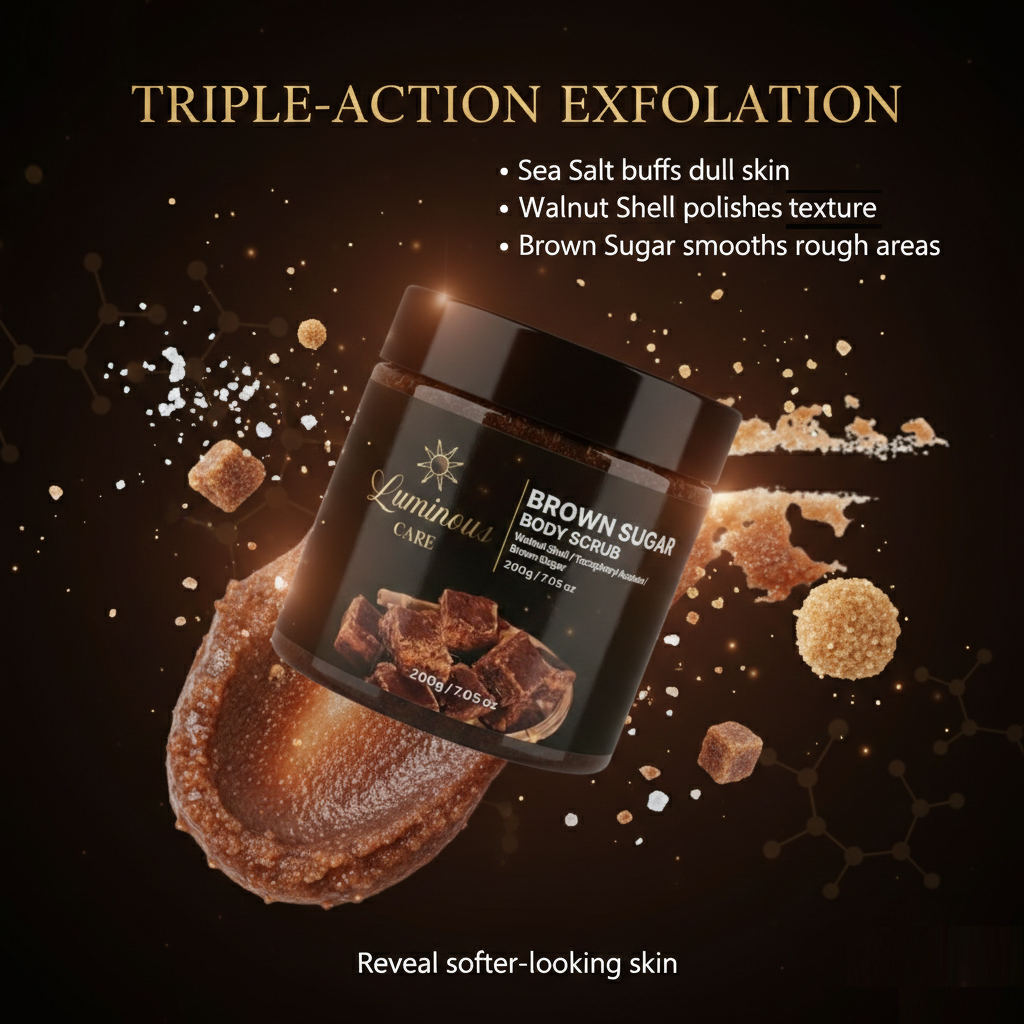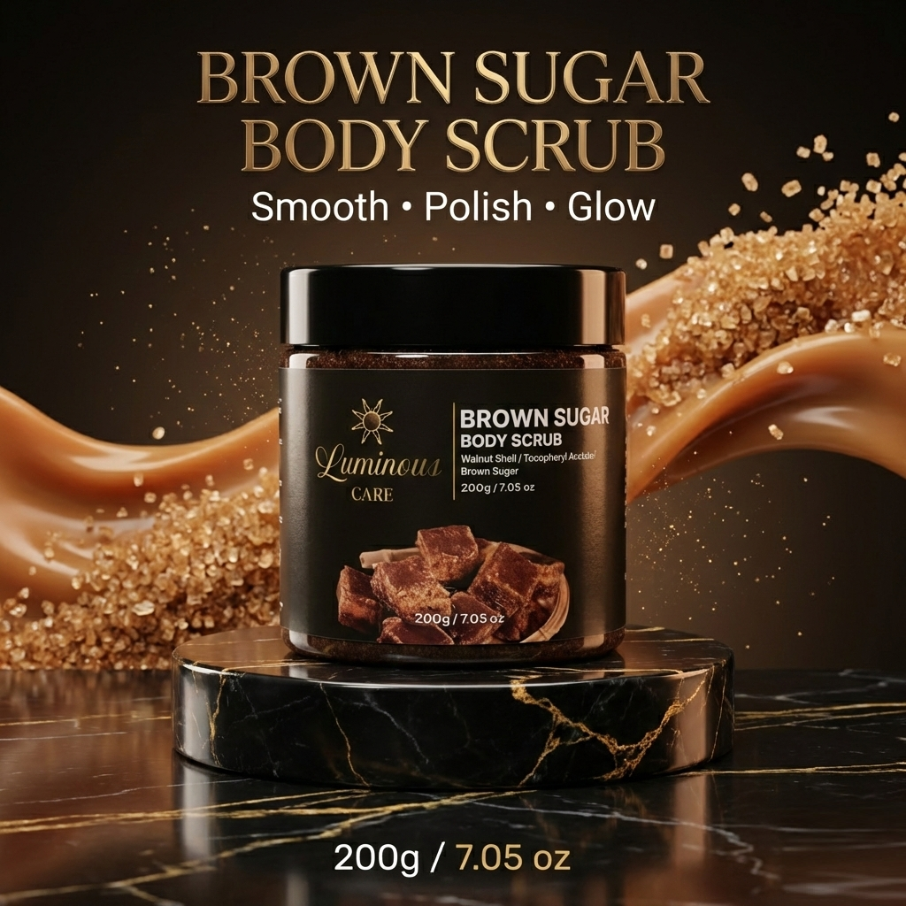 Smooth and refresh your skin with the Luminous Care Brown Sugar Sea Salt Body Scrub. This exfoliating blend combines brown sugar, sea salt, and walnut shell powder to help remove dead skin and rough texture while leaving skin soft and moisturized. Perfect for weekly self-care routines with a warm brown sugar scent.