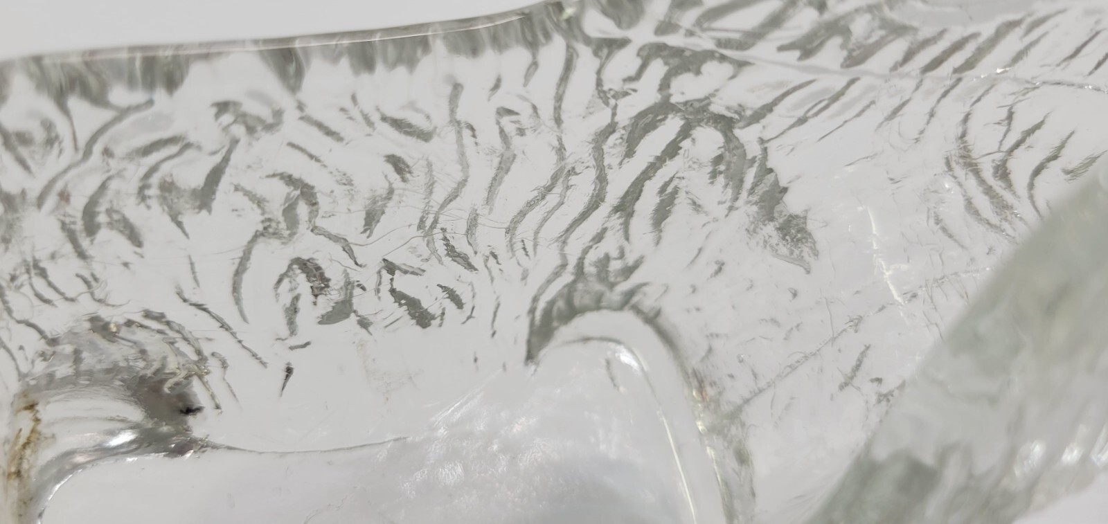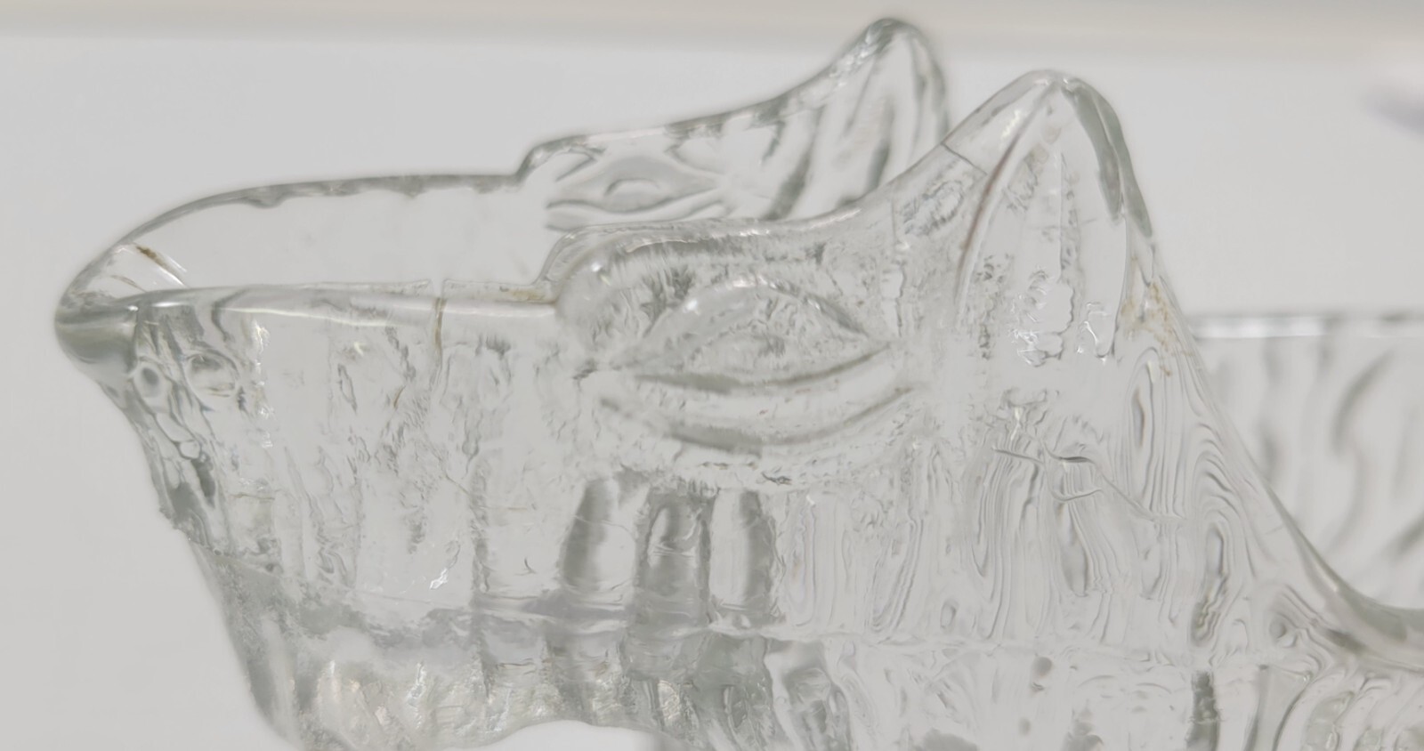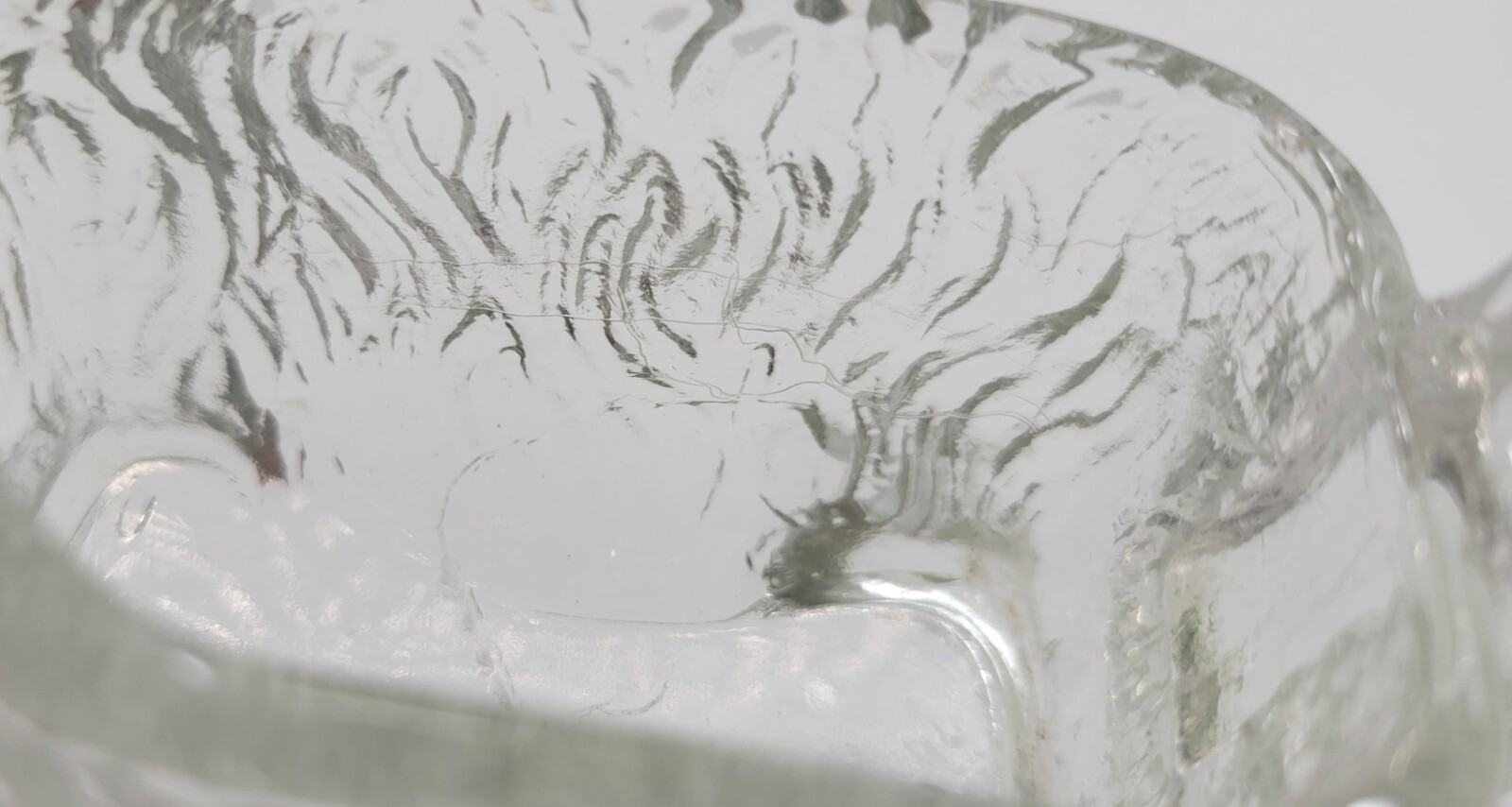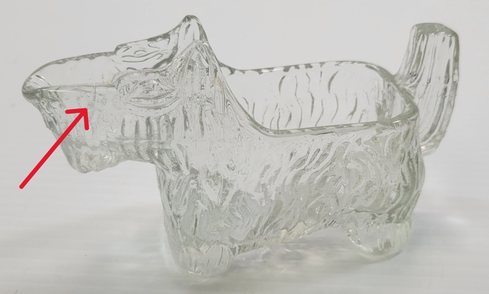 Creamer is in vintage used condition with some signs of age and use. There are some spider web lines throughout the glass similar to crazing. They are hidden well with the design pattern of the glass but visible when closely examined. There is a very slight crack at the nose/spout of the creamer. The crack is also difficult to see but can be felt. It is hard to depict in photos as well, but please see pictures identifying the location.