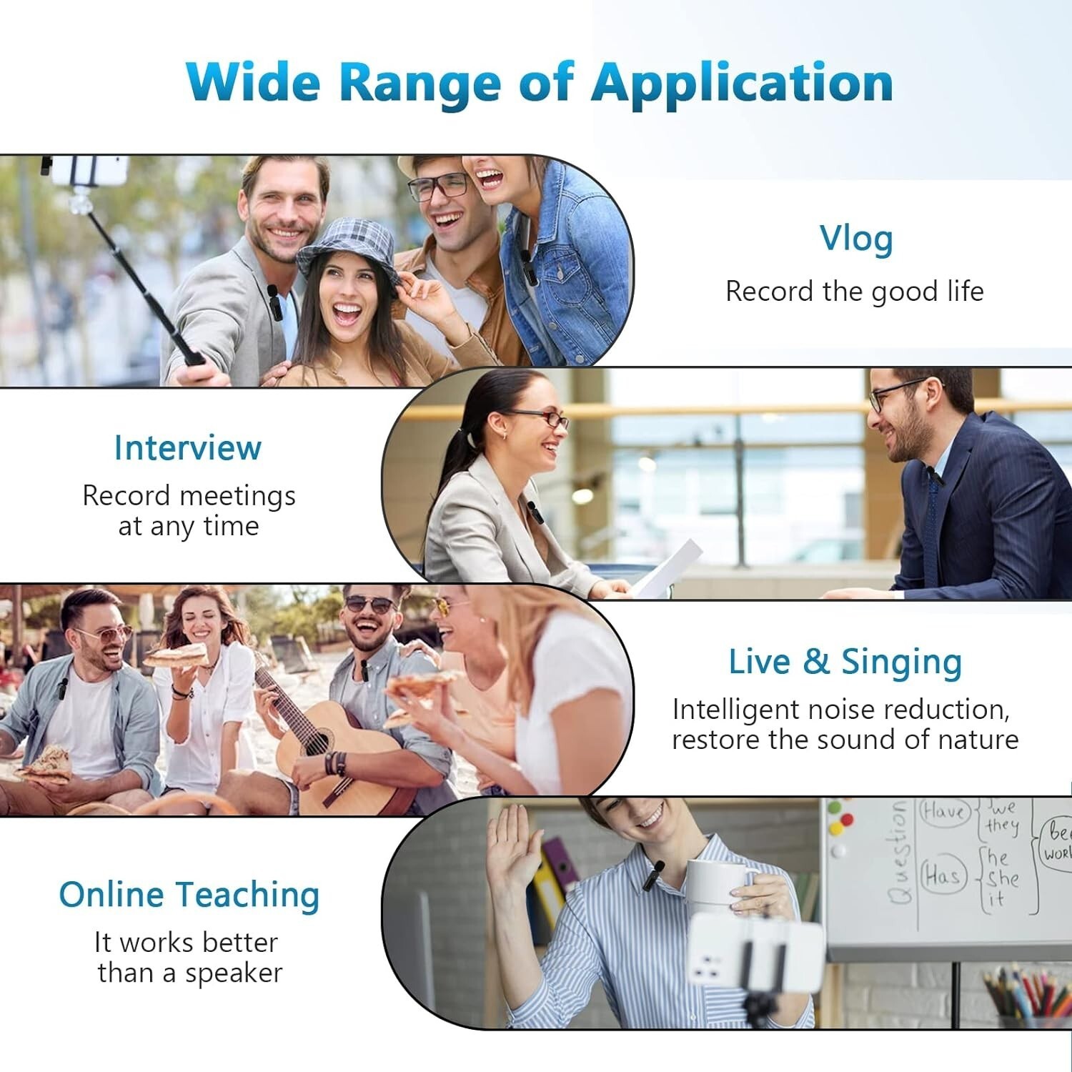 Two-person recording: This portable lapel mic has a receiver and two transmitters to support two-person recording for the convenience of team workers. Also equipped with blowout resistant foam sponge, can pick up sound in all directions. The 360-degree rotating collar clip clips the microphone to your shirt, freeing your hands to record from a distance. In this way, action shooting, mobile phone recording and short video production can be completed in various large scenes."