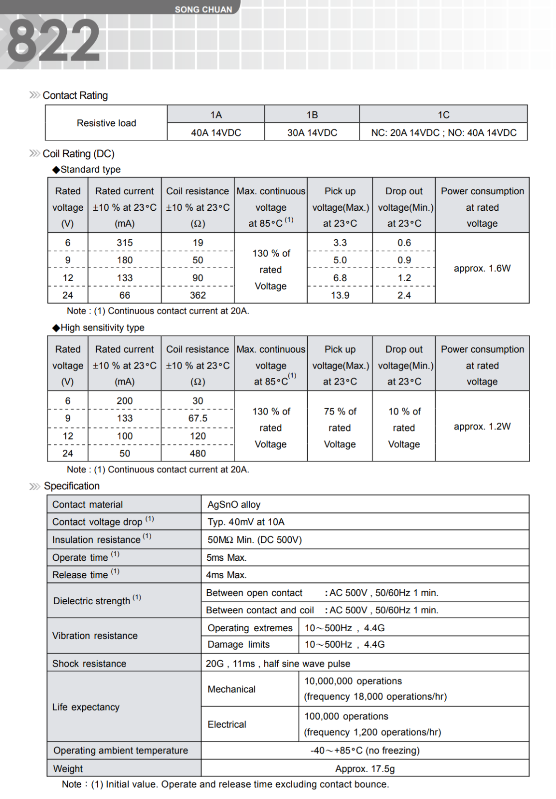 822E-1C-C-12VDC Song Chuan High Power PCB Relay 12V SPDT 20A/40A 14VDC 7Pin