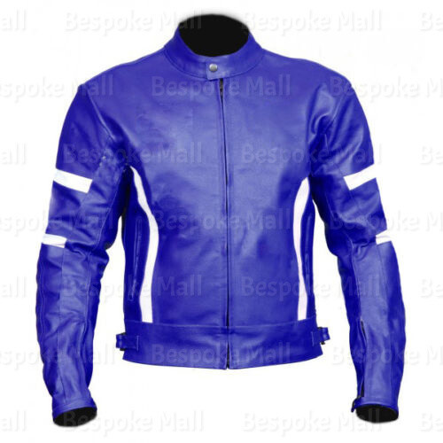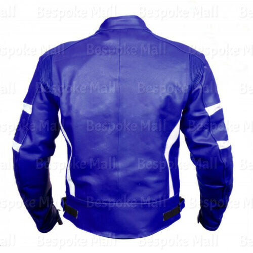 New Men's Blue White Stripes Motorcycle Cowhide Leather Jacket Safety Pads-932