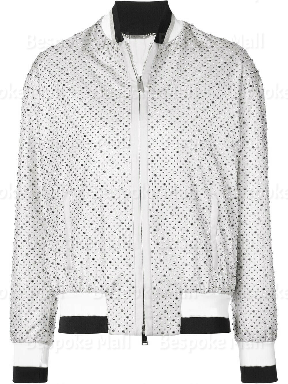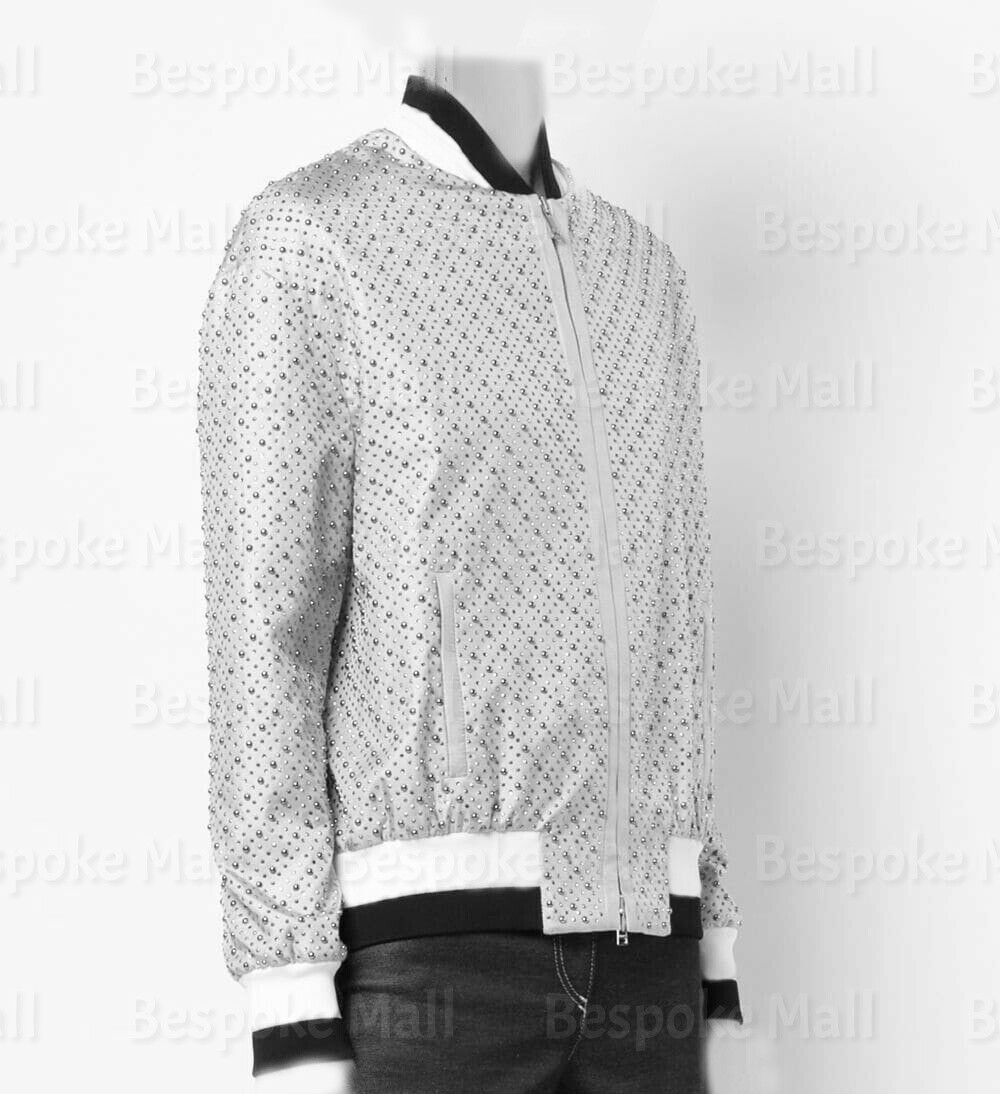 New Men's White Silver Studded Club Punk Rock Cowhide Biker Leather Jacket-644