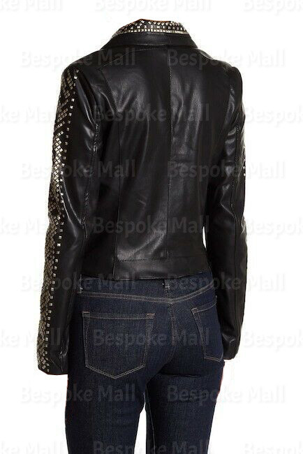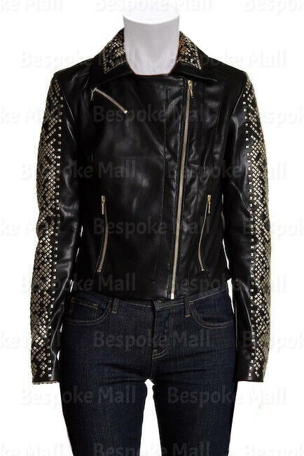 New Women's Black Notched Collar Genuine Leather Gold Studded Biker Jacket-194