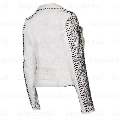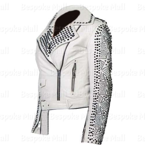 New Women's White Punk Metallic Studded Star Design Genuine Leather Jacket-668