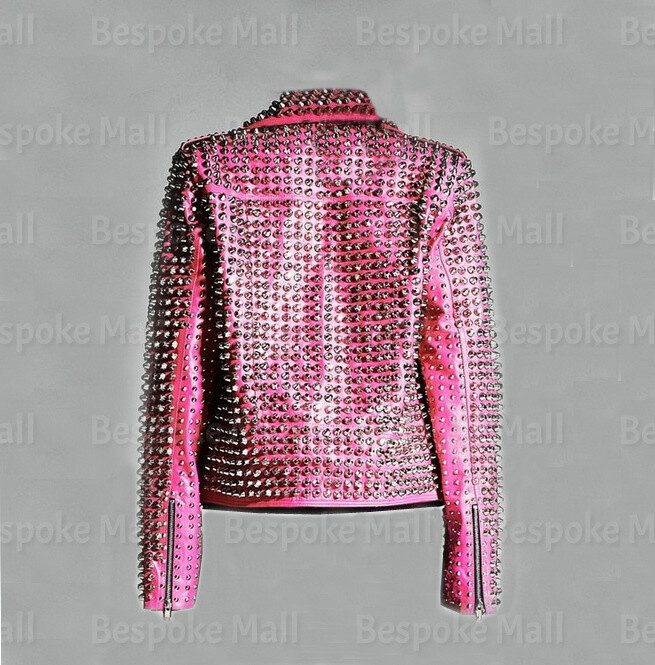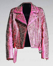 New Women's Baby Pink Silver Studded Punk Rock Belted Biker Leather Jacket-848