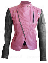 New Handmade Woman Pink Black Brando Biker Genuine Cowhide Leather Jacket-169