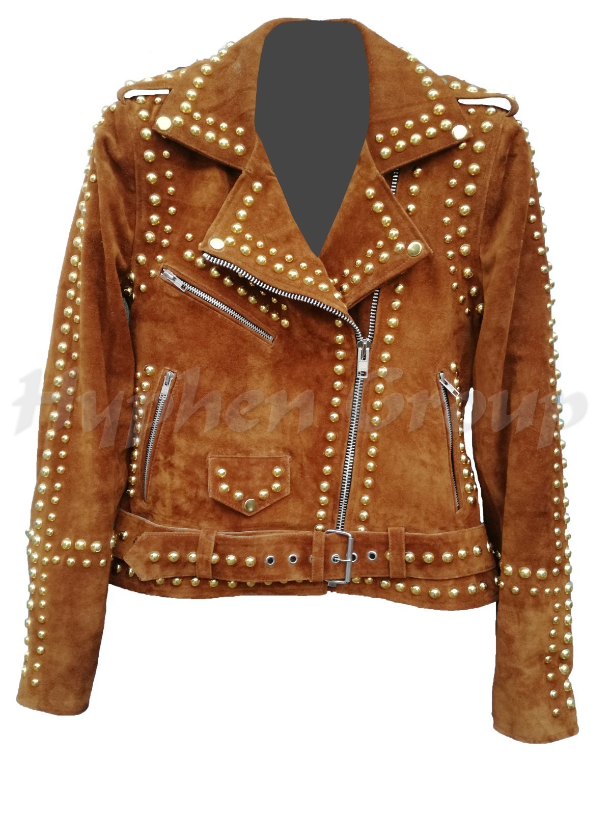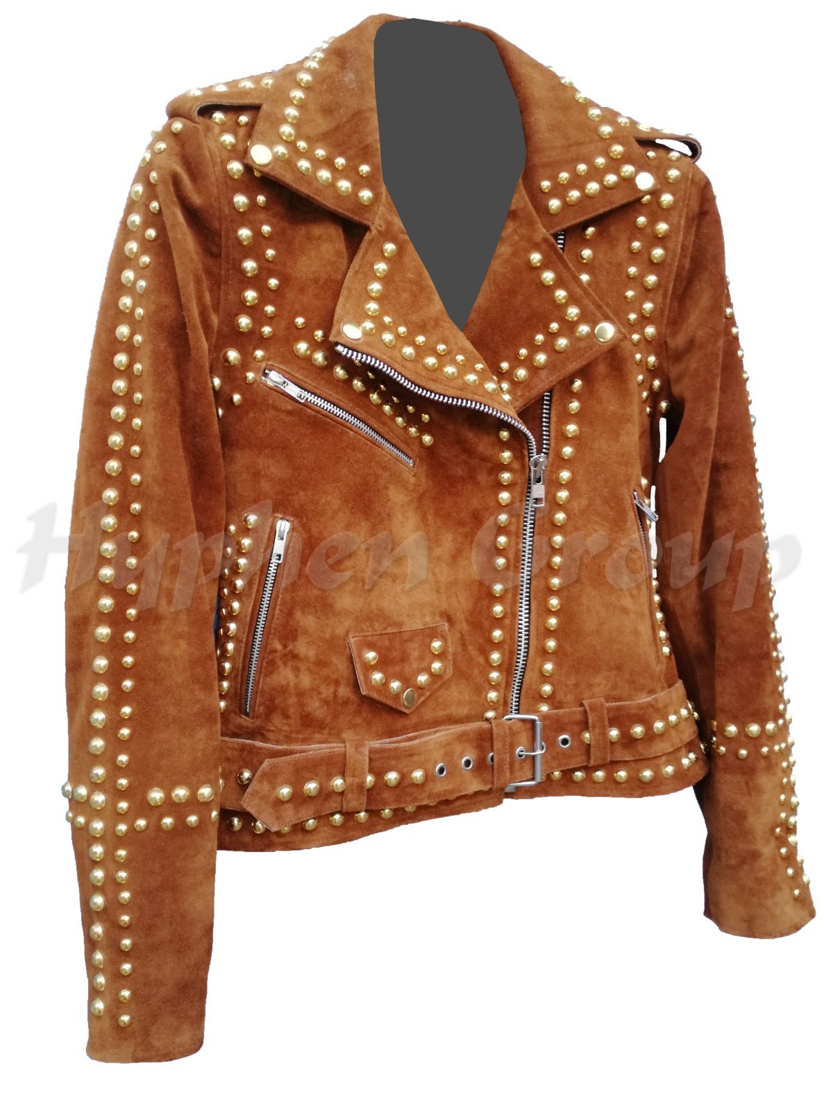 New Women Gold Studded Western Style American Brown Suede Leather Jacket