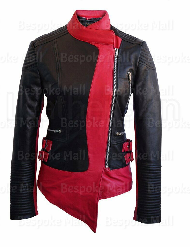 New Woman's Handmade Red Black Unique Brando Cowhide Soft Leather Jacket-599