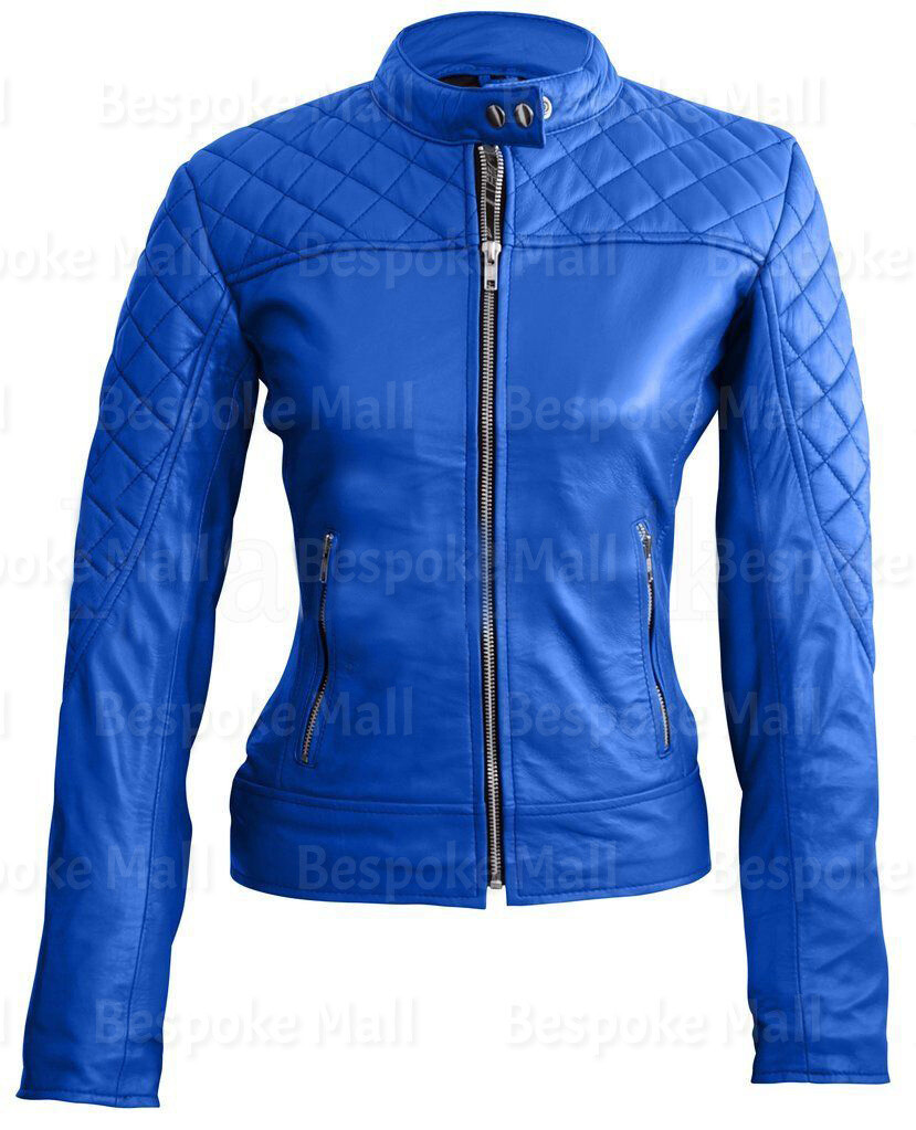 New Handmade Woman Full Blue Fashion Quilted Cowhide Leather Jacket-164