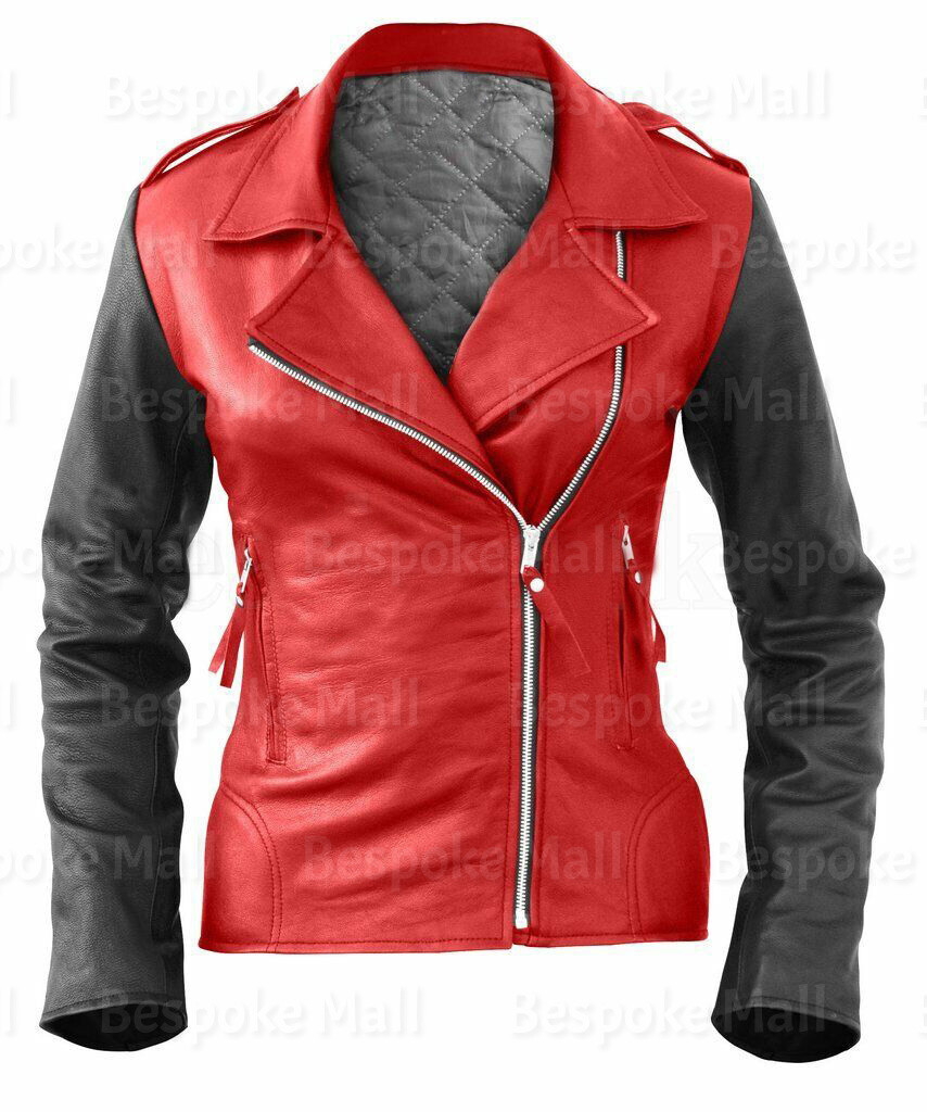 New Handmade Woman's Red & Black Brando Style Real Cowhide Leather Jacket-293