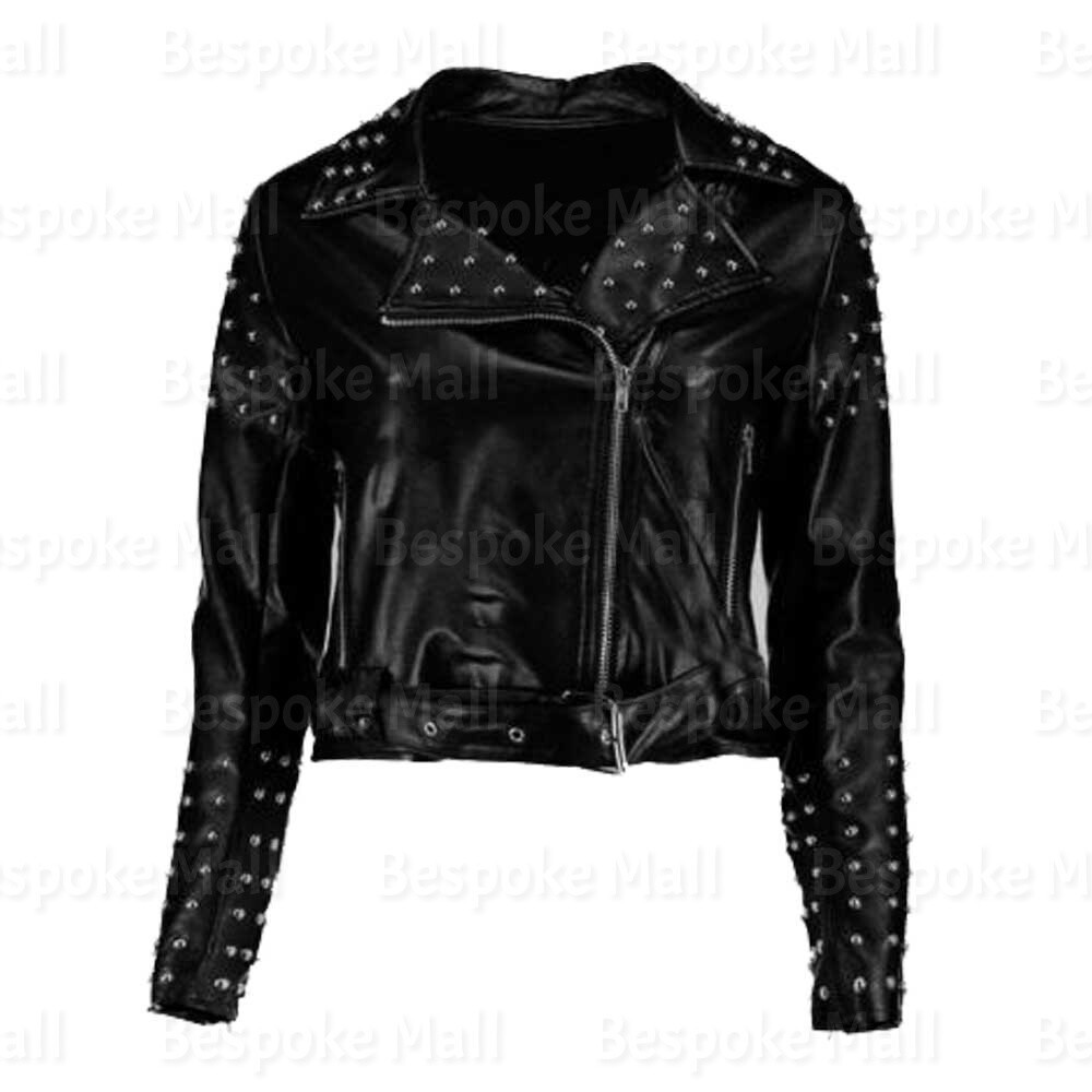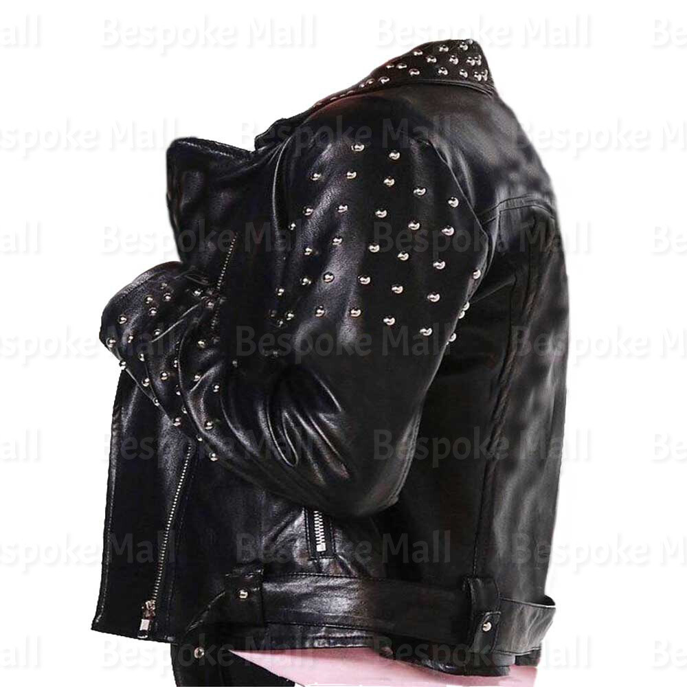 New Woman Brando Style Half Silver Studded Black Leather Jacket All Size-21