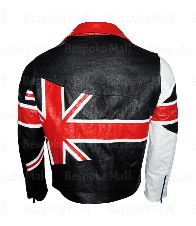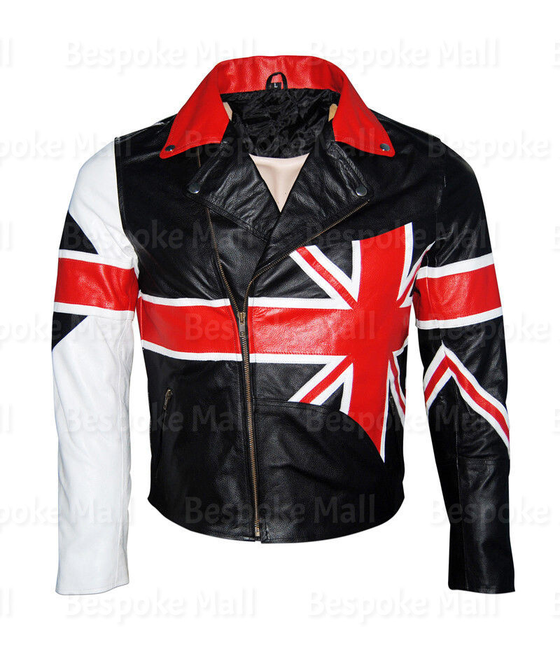 New Men's UK Flag Brando Style Black Classic Genuine Cowhide Leather Jacket-534
