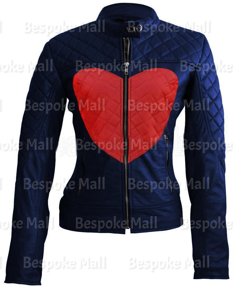 New Woman's Love Blue Red Heart Quilted Cowhide Motorbike Leather Jacket-327