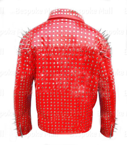 New Men's Red Punk Silver Long Spiked Studded Brando Cowhide Leather Jacket-528