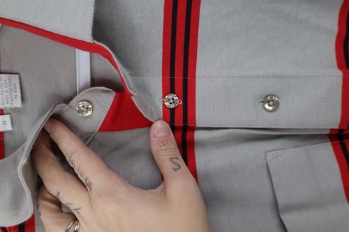 Blemishes back top. Dark spots, pilling. Design distressed. Collar, arms discolored. Color faded. Made in USA