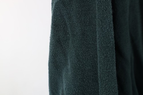 Discolored, dark spots throughout. Designs distressed. Collar, cuffs discolored. Color faded. Pilling