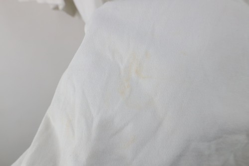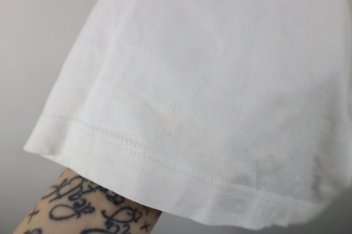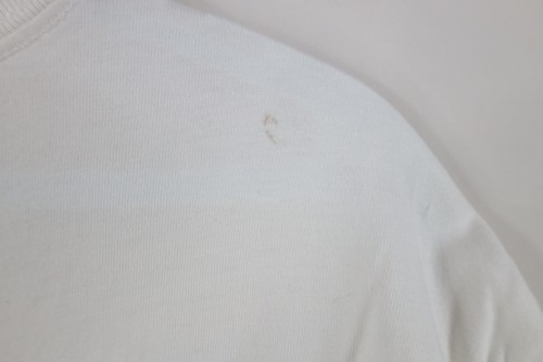 Stains throughout. Collar, armpits discolored. Yellowed. Graphics faded. Pilling