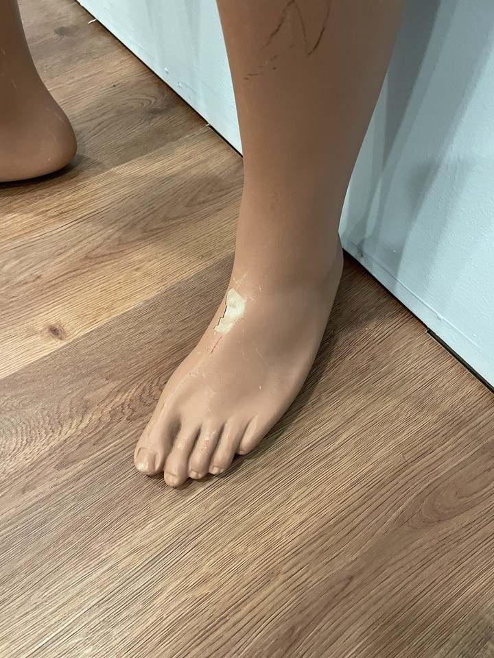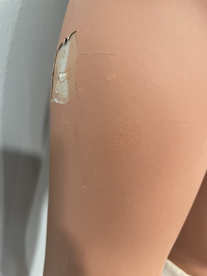 His issues are: some areas of light scrapes and marks throughout the body as to be expected from a used mannequin, no other major issues.