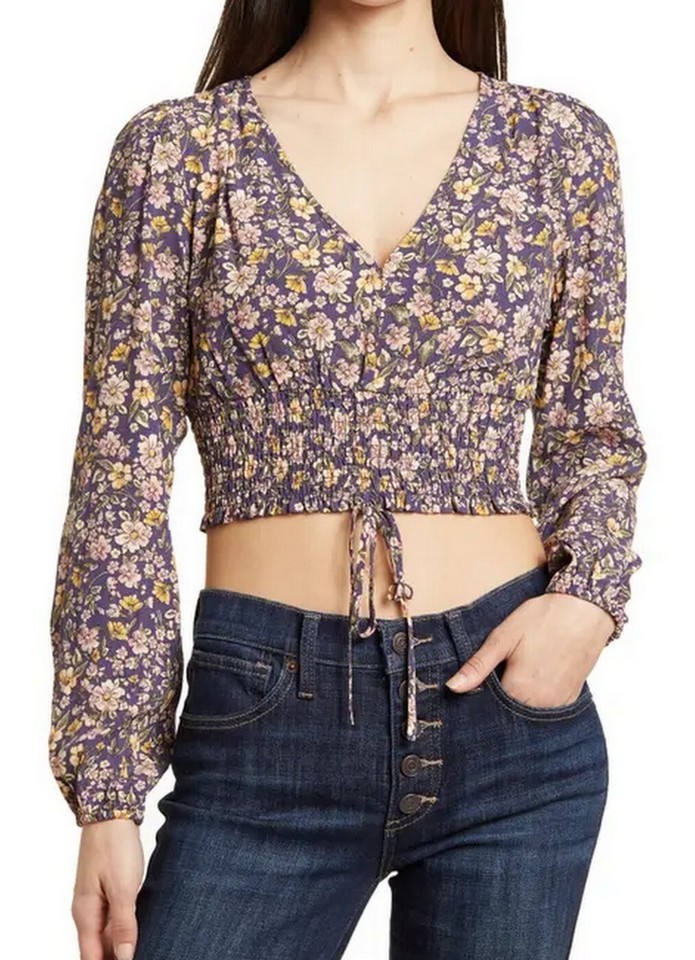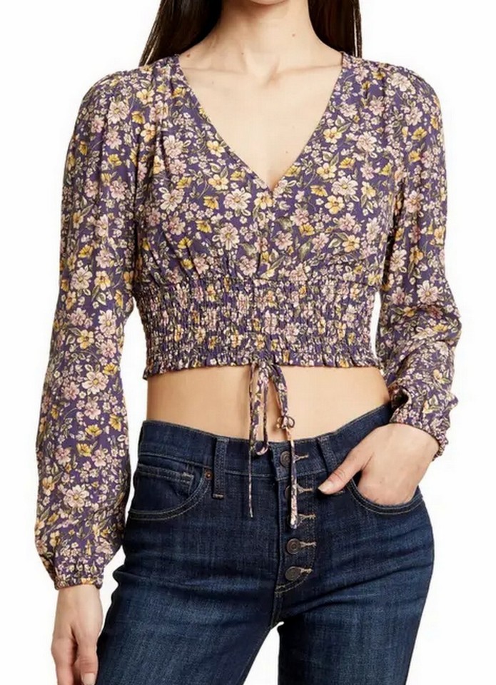 Elodie Women's Long Sleeve Smocked Waist Crop Top, Purple Floral Size S, M, L