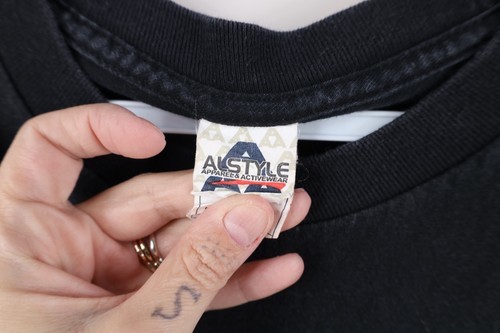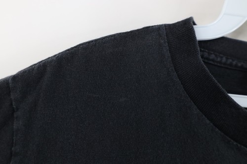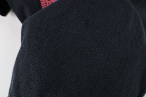 Dark spots/stains front. Blemishes throughout. Collar, shoulders, arms discolored. Graphics, color faded. Pilling. Writing on tag