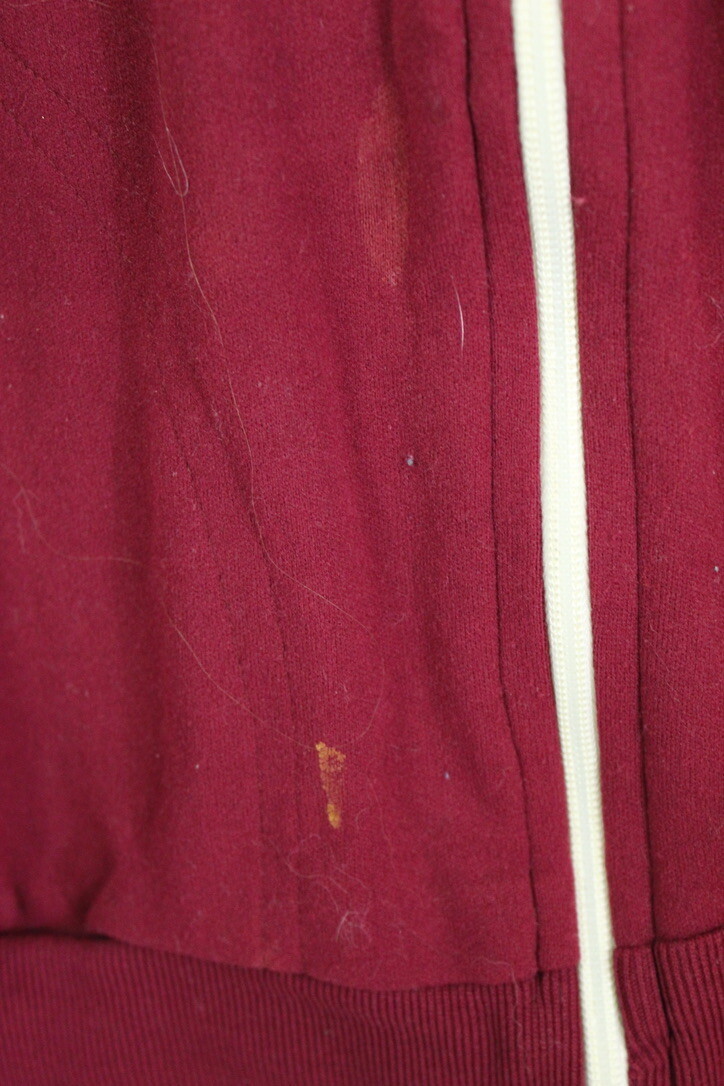 Vintage 1980s TENeX track jacket in maroon red with white striping. Made of 100% stretch nylon, designed with front zip, ribbed cuffs/hem, and two pockets. Strongly reminiscent of the Adidas jackets made famous by Run DMC and 80s hip-hop culture.
