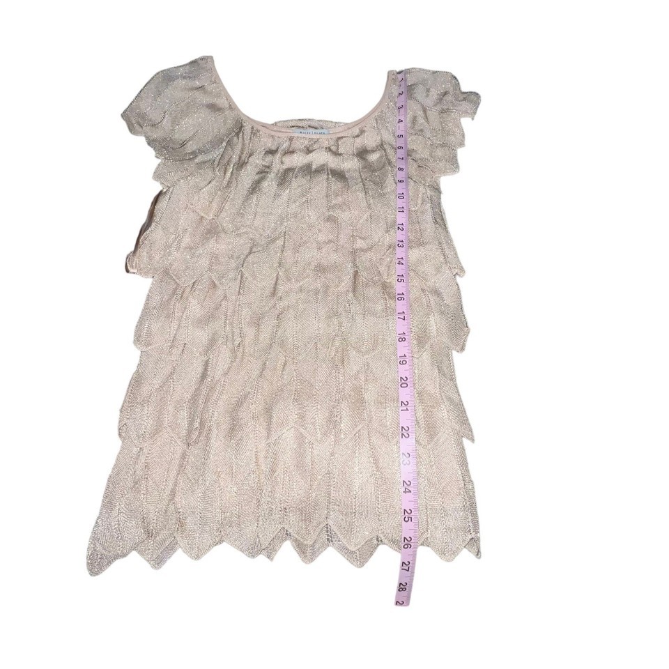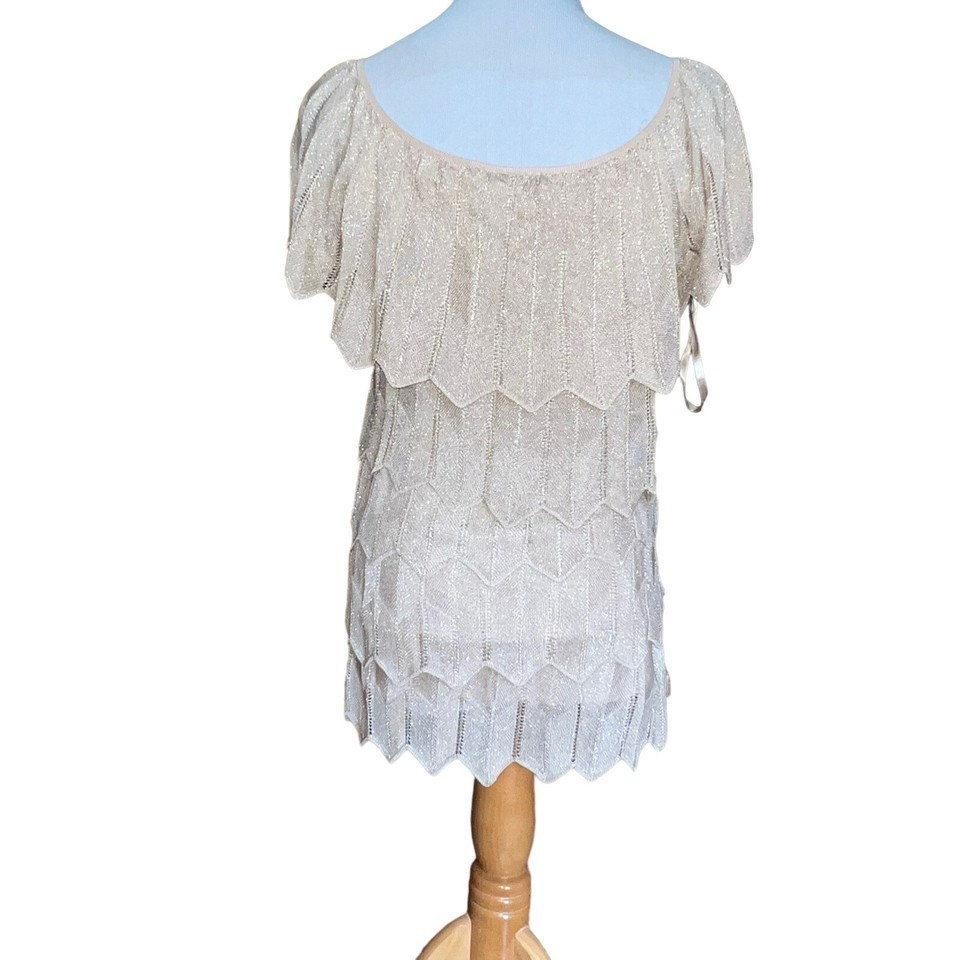 This is a pre-owned White House Black Market metallic blouse in gold. It is a size small and features a boat neckline, cap sleeves, and a pullover closure. The blouse has a tiered design with ruffles and sequins, and is made of a polyester and rayon blend material with a glittery finish. It is a classic fit and has a lining, stretch, and can be worn in all seasons. The blouse is suitable for travel, parties, casual wear, workwear, and business attire. It has a resort wear, designer, Christmas, holiday, metal, and classic theme.