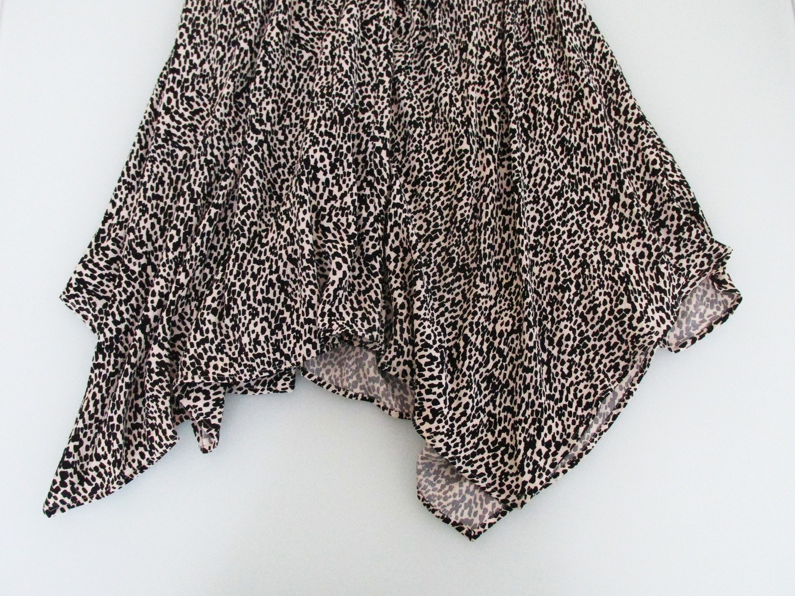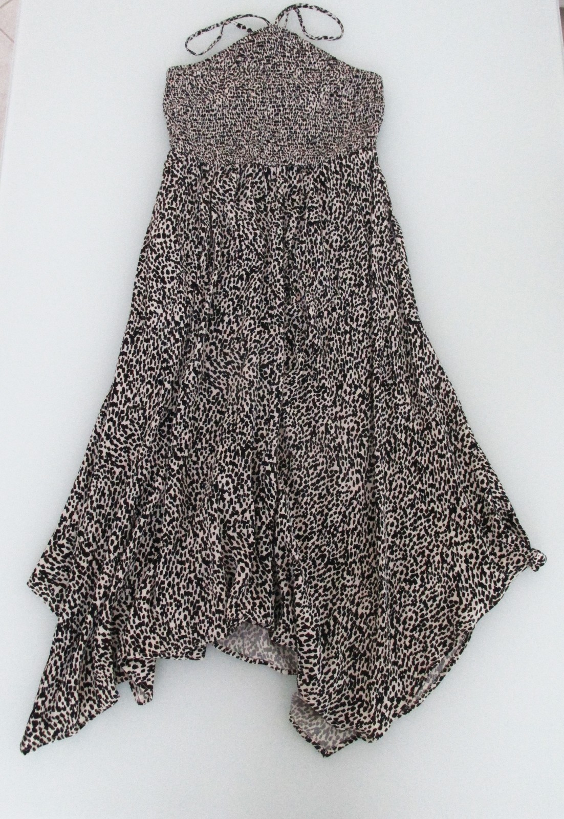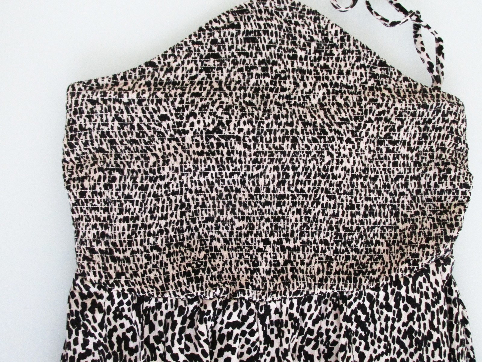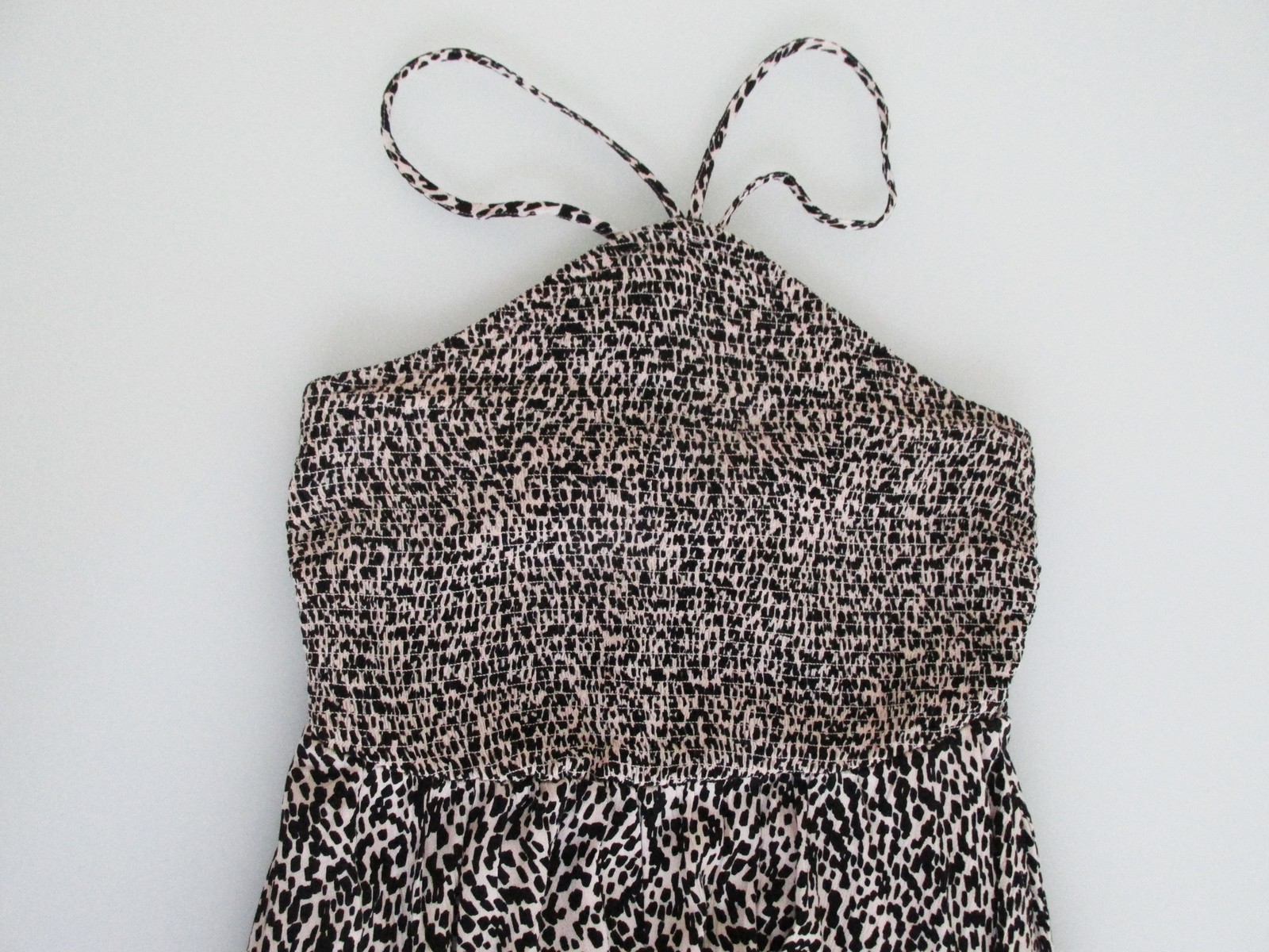 Description: Up for sale is an Old Navy women's halter dress. The size is medium. This dress is made of rayon fabric.This dress has a black ivory animal print pattern. The dress has a halter tie with an elastic bodice. It features a handkerchief bottom.