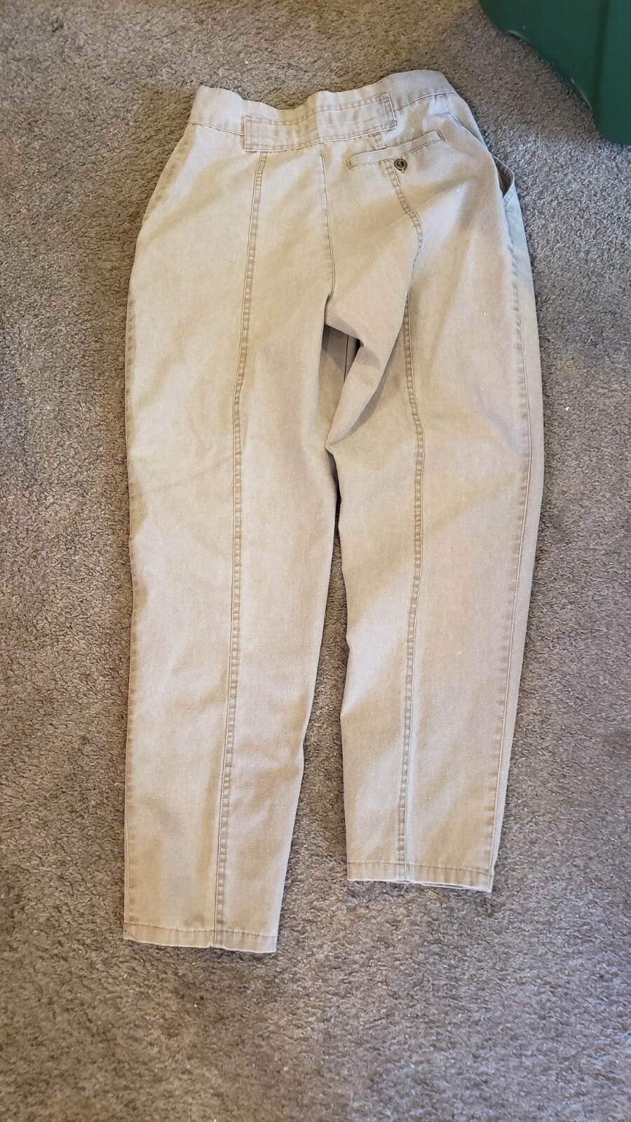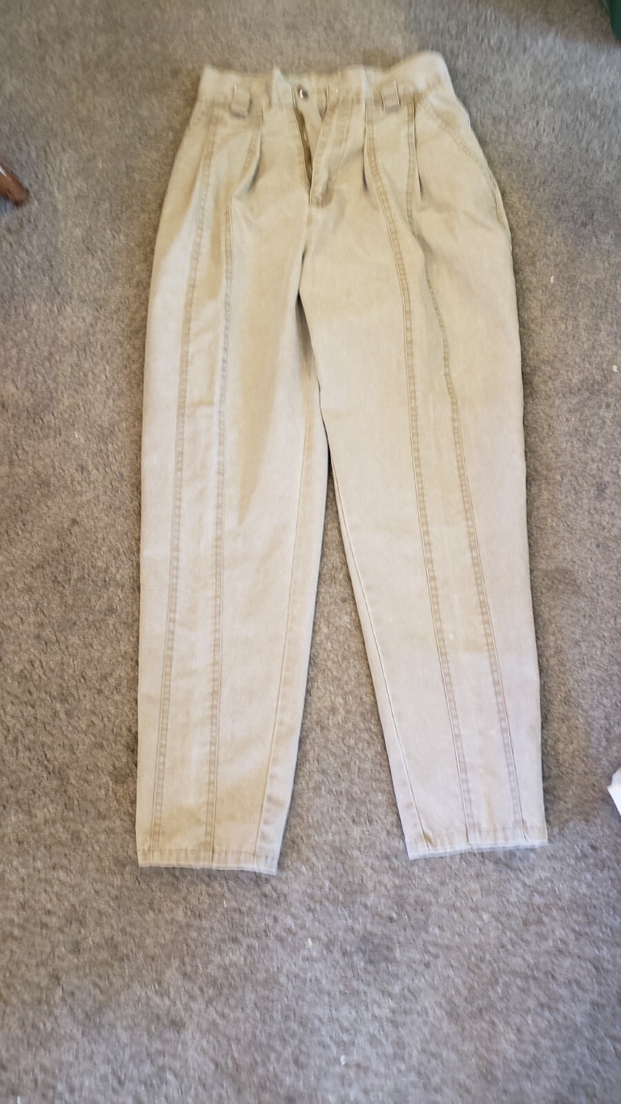 Vintage 80's Women's Justin Allen Tan Dress Pants Pleated/Lined Front Size 5-6 Med size 5/6 (this was 5/6 back in 70's and 80's - don't know what it is today) I got all my vintage clothes from a hardware store that had a bunch of overstock inventory they were holding on to for 20-40 years. There is some dust and shelf wear on some of these clothes, due to them having sat so long on shelves. There may also be a musty odor from the years. All are in perfect structural condition. Dimensions - 27-28" from crotch to end of pant 39-40" total length Will Ship International Please look at pictures and ask questions if you have them Also please note I am in the military reserves and sometimes get called away for duty.