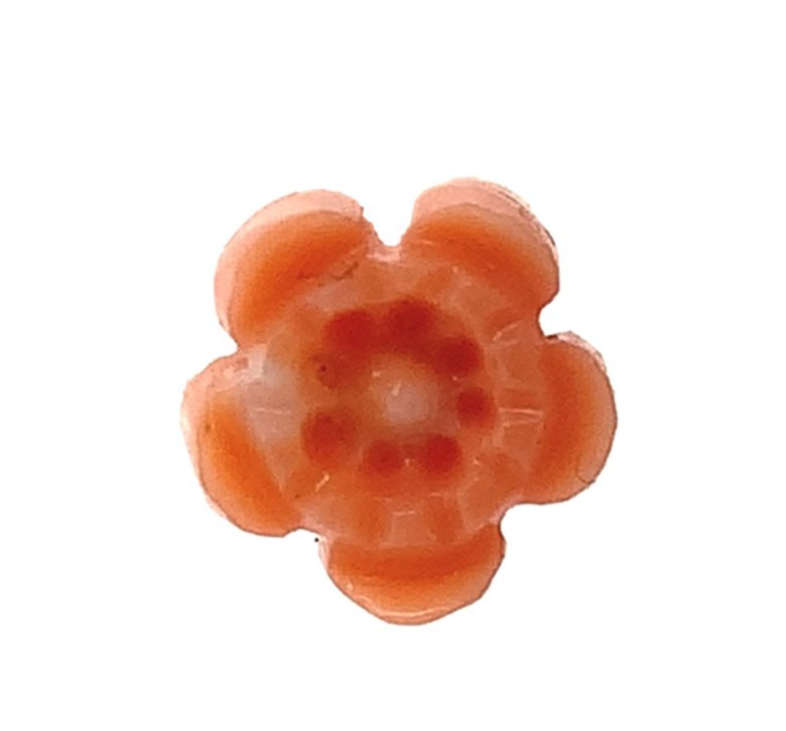 A pair of 14k rose gold coral flower stud earrings. The coral is a light salmon color with some white. The carved flowers are about 7mm. The earrings are similar but not an exact match. The pair weighs .63 dwt., and are new. Lovely!