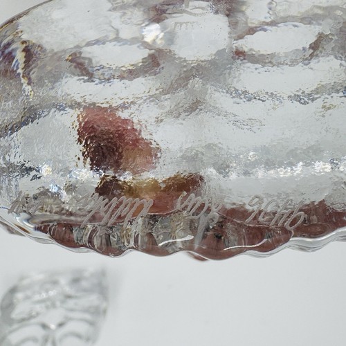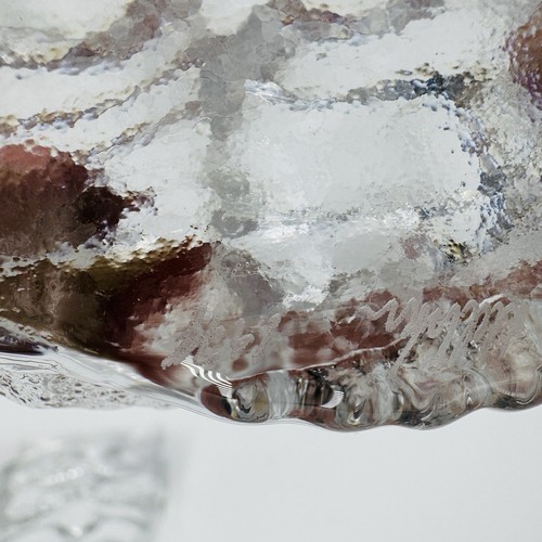 The owl subject and abstract pattern make this figurine a unique addition to any collection, and it was produced using studio crafting techniques in Sweden. The backstamp is impressed and the item is an original, not a licensed reproduction. This Skruf Sweden Glass owl figurine is perfect for anyone who loves art glass and wants to add a touch of sophistication to their home decor.