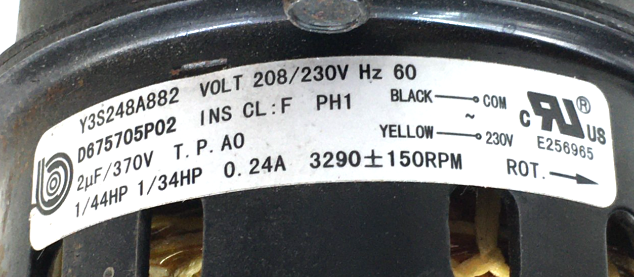 This is Broad-Ocean Y3S248A882 Draft Inducer Blower Motor D675705P02 208-230V 1/44HP 3290 RPM used part.