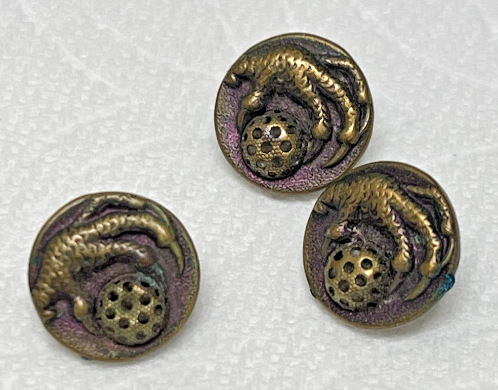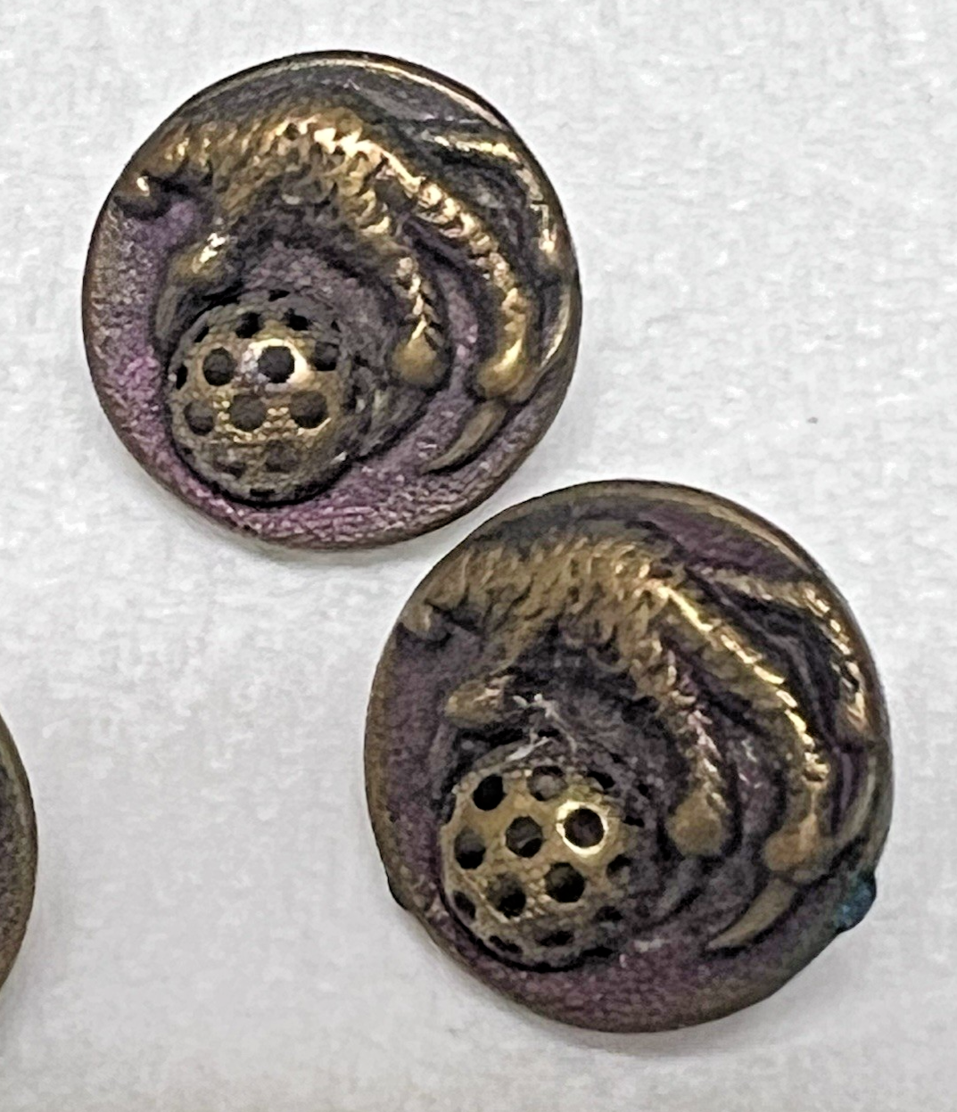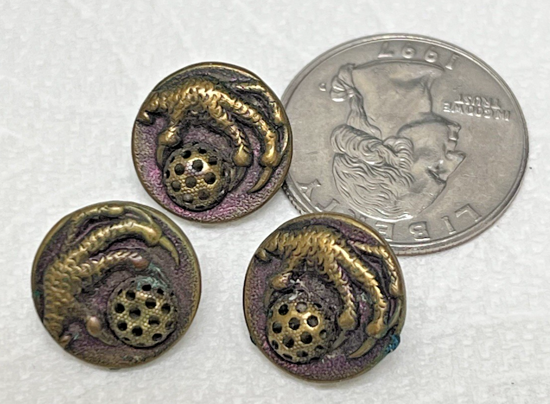 3 Antique Round Metal Dress Buttons Bird Claw w Openwork Ball Purple Wash 1/2"