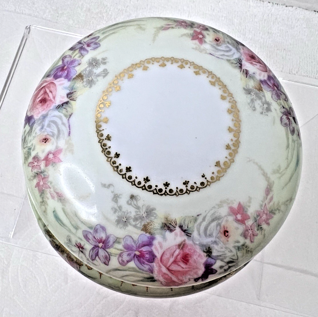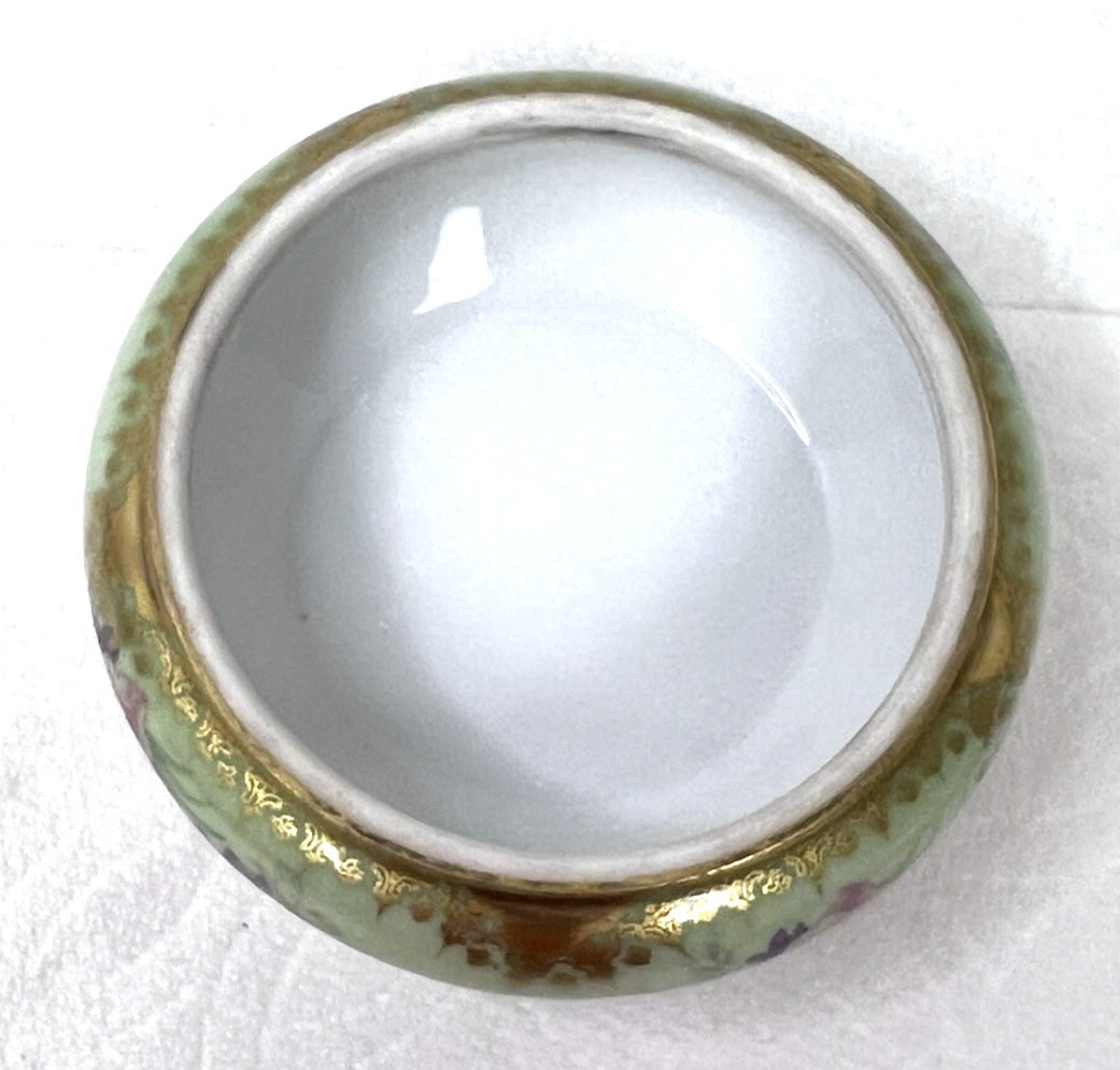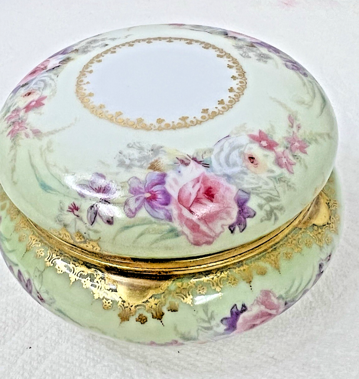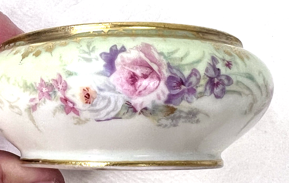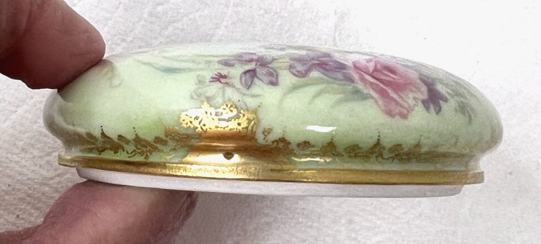 Elite Limoges France Powder Jar Box Pink Roses w Purple Flowers Light Green GOLD no chips or breaks and the gold is bright. The base is 3 3/4 at the widest and 2 1/4 inches tall