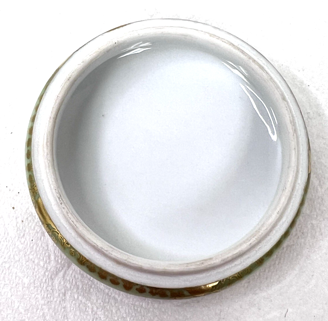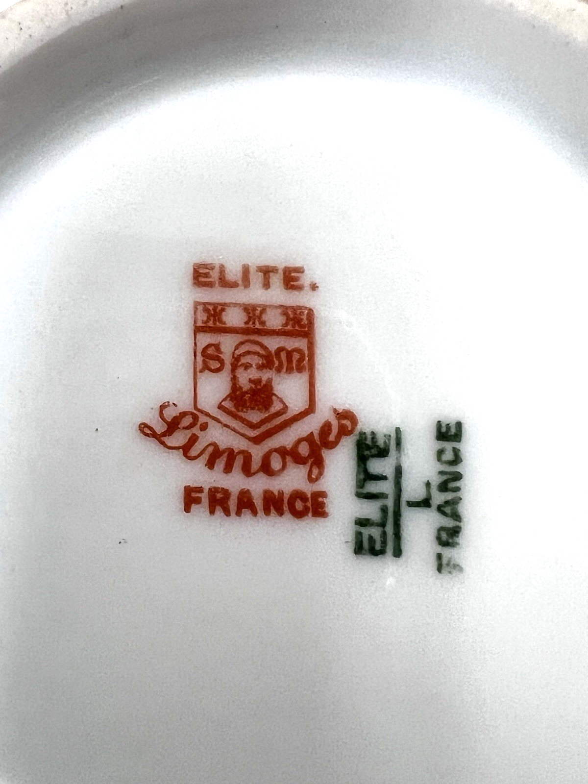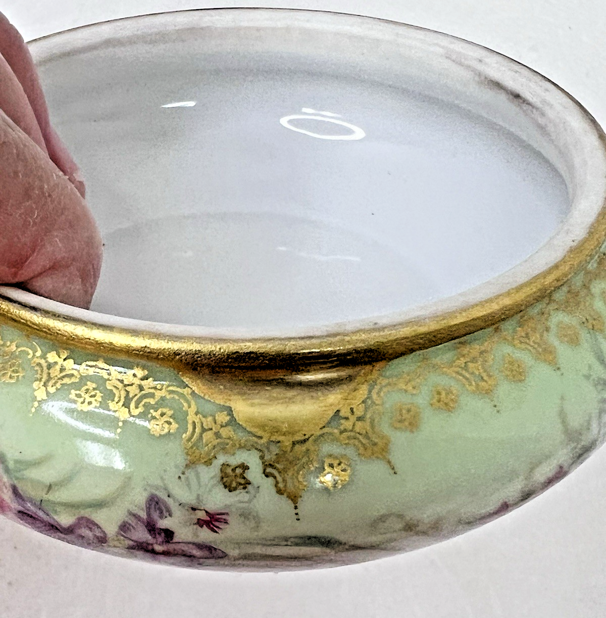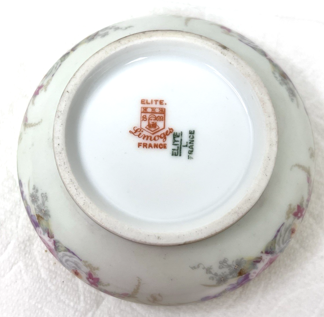 Elite Limoges France Powder Jar Box Pink Roses w Purple Flowers Light Green GOLD no chips or breaks and the gold is bright. The base is 3 3/4 at the widest and 2 1/4 inches tall