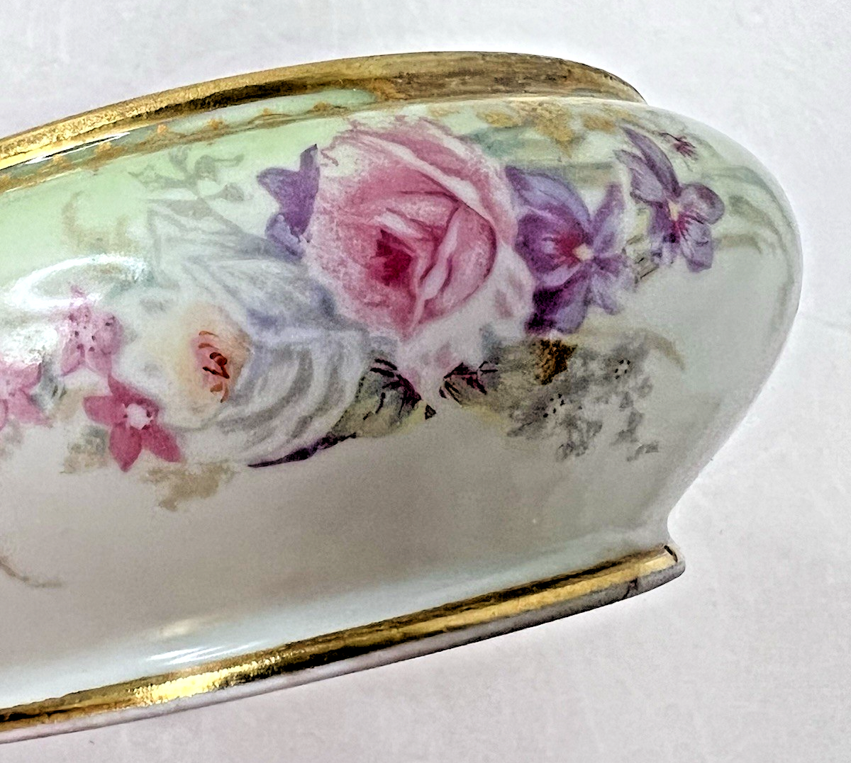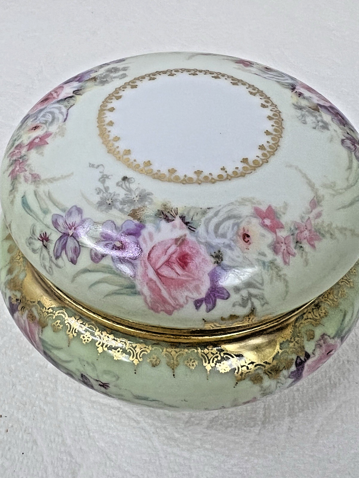 Elite Limoges France Powder Jar Box Pink Roses w Purple Flowers Light Green GOLD