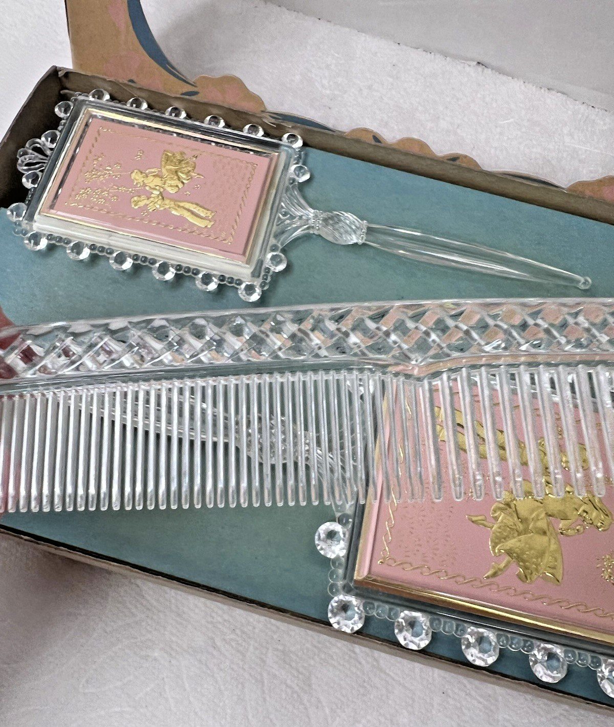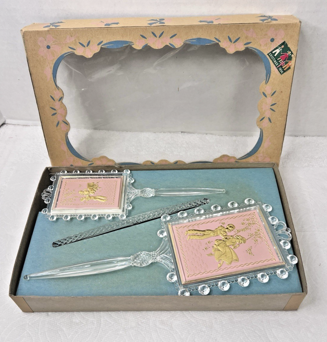 Vintage Little Girls 3 Piece Comb Brush Mirror Set Original Box Unused Pink Gold