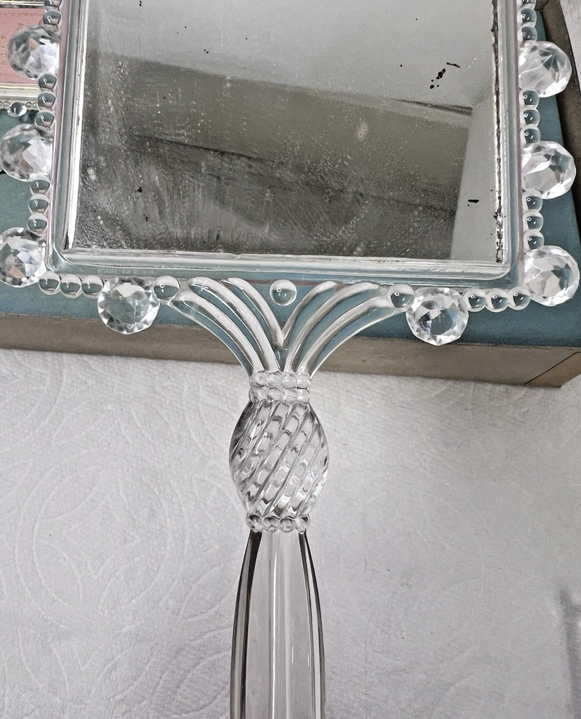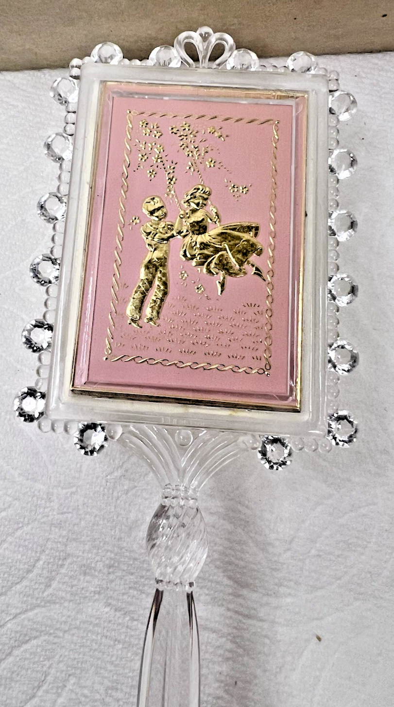 Beautiful pink and gold with clear looks never used box also in great shape as is the set. However, the plastic cellophane cover does have a small tear also the mirror is slightly cloudy normal for old mirrors.