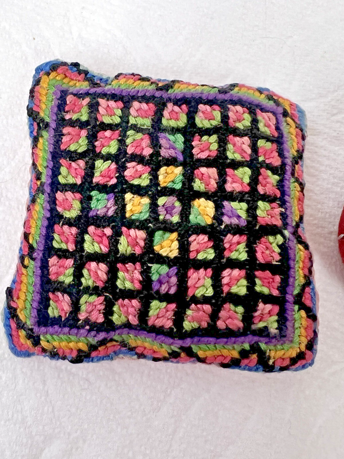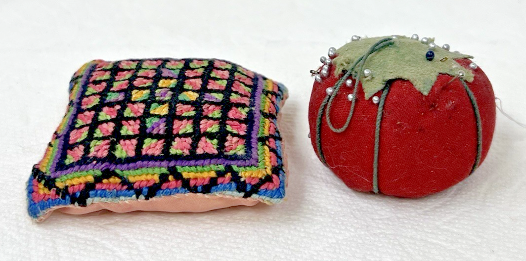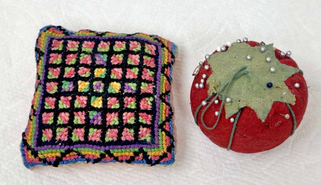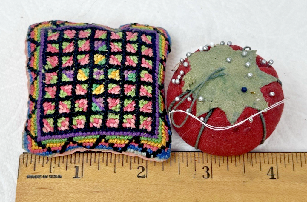 2 Antique Small Pincushions 1 Tomatoe 1 Needlepoint Colorful and Sweet