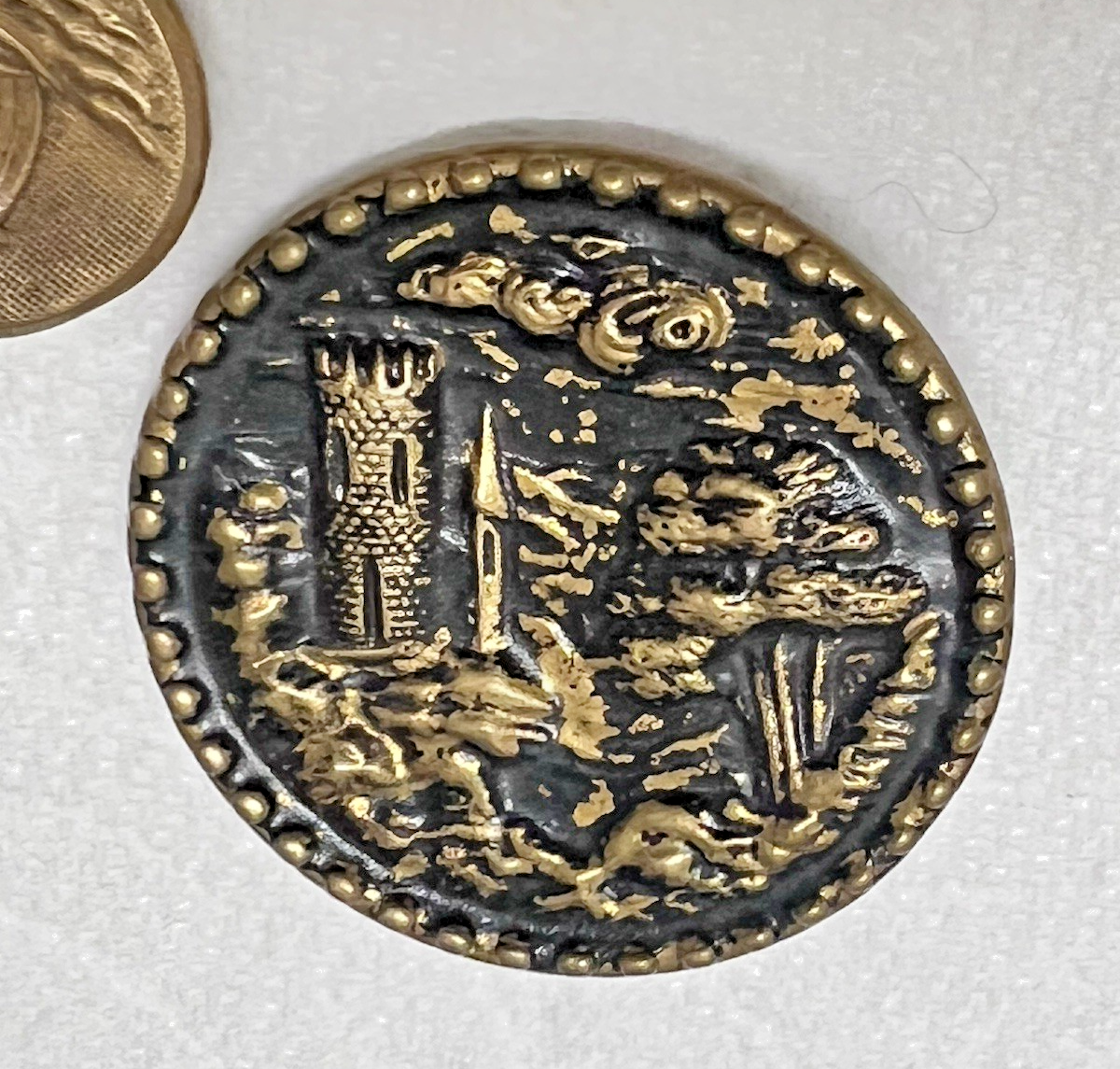 7 Antique Round Metal Picture Buttons Flowers Castle Ship Horseshoe Designs More they range from 3/8 to just shy of 1 1/2 inches a mix of gold tone and silver tone