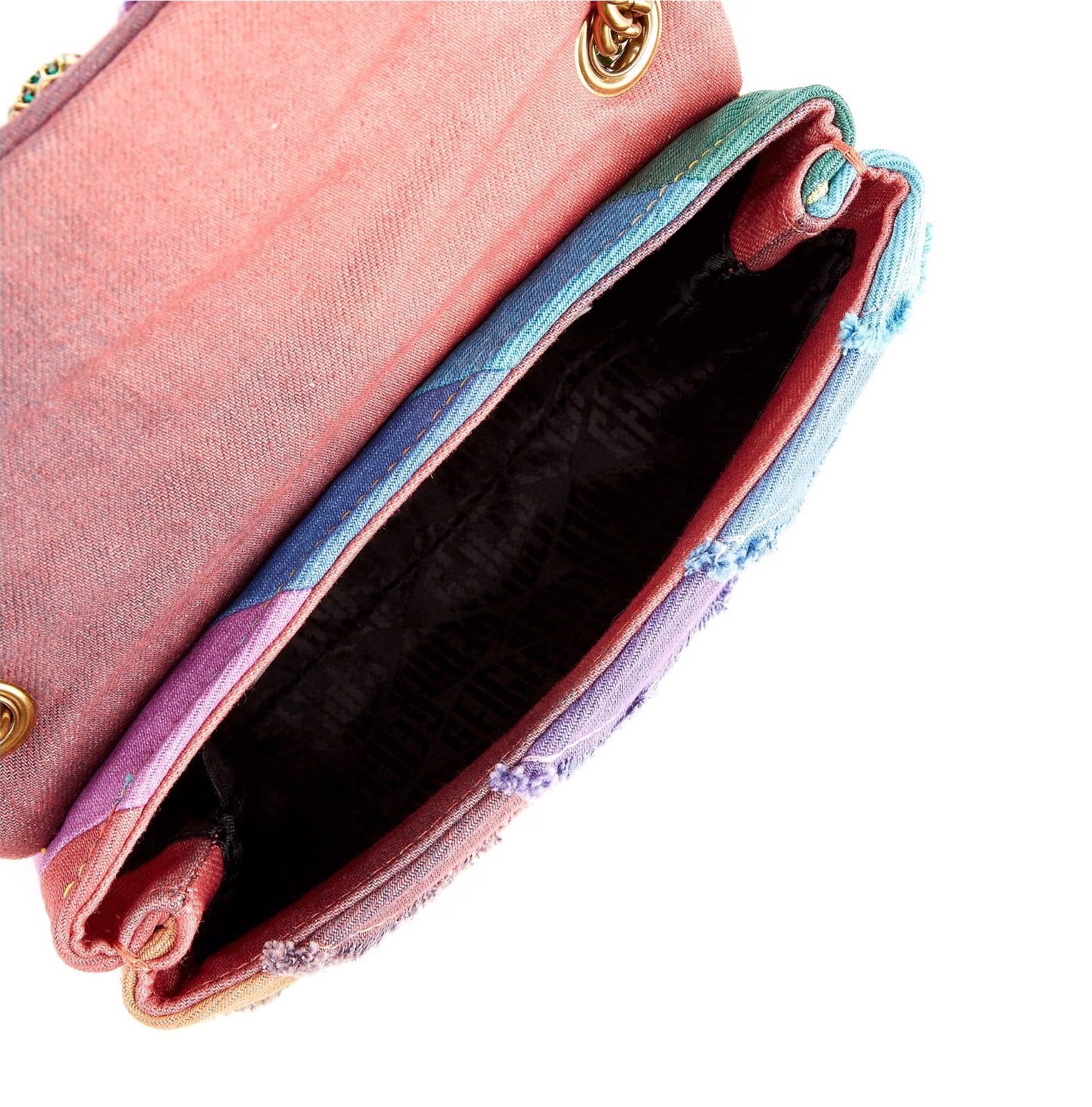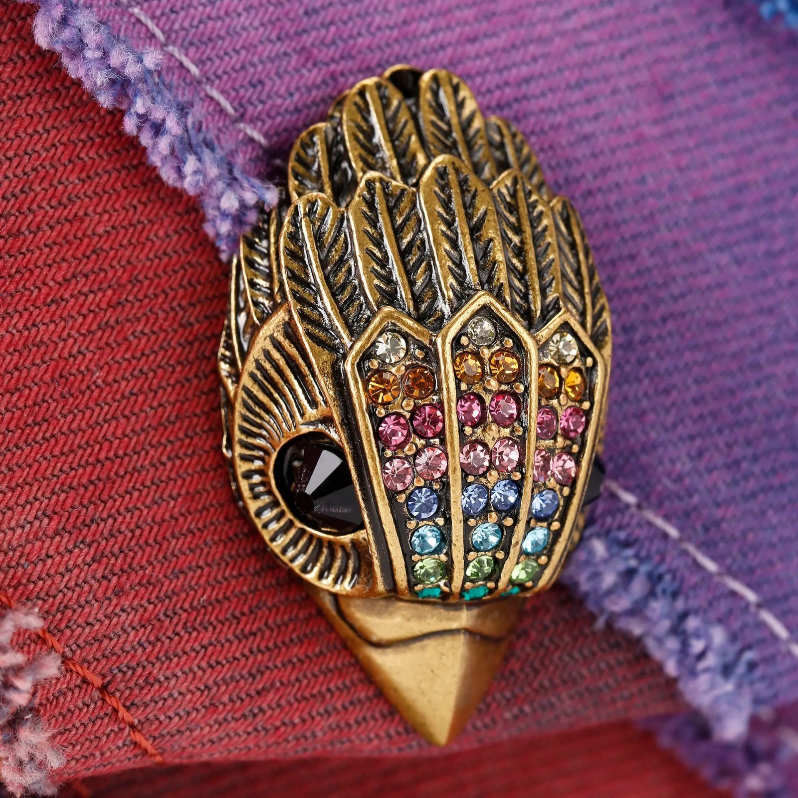 washed rainbow denim in a frayed stripe design. The antique brass eagle head